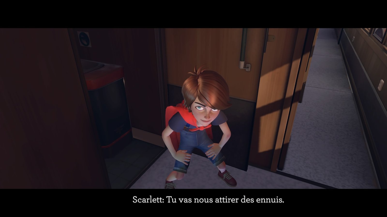 C’est au travers des yeux de Scarlett que l’histoire prend pied. Son reflet dans la vitre d’un train en marche, suivi d’un rapide coup d’œil autour d’elle suffisent à me rendre compte que nous sommes seuls. Dans l’air, il y a comme une étrange sensation, celle de l’isolement. Comme il n’y a pas vraiment d’autre choix que d’avancer, c’est ce que je fais. Je fais très vite la rencontre du facétieux Finn. Il semble malin comme un singe et incapable de tenir en place. Il a une bonne bouille et porte une cape rouge comme s’il se prenait pour un super héros. Tout le long de cette aventure, jamais il ne voudra se confronter directement aux questions qui fâchent, alors que régulièrement dans ce monde sans doute issu de son imaginaire, les figures de leur famille et connaissances s’afficheront dans des corps statiques en noir et blanc, arborant des masques d’animaux semblant avoir été fait par les mains d’un enfant.