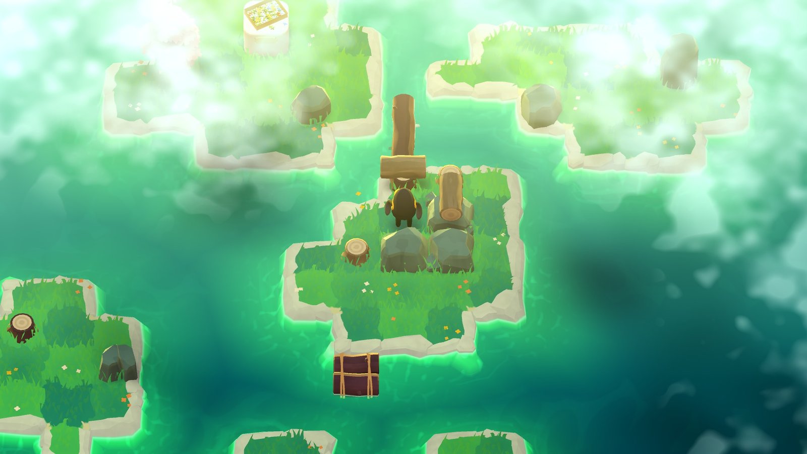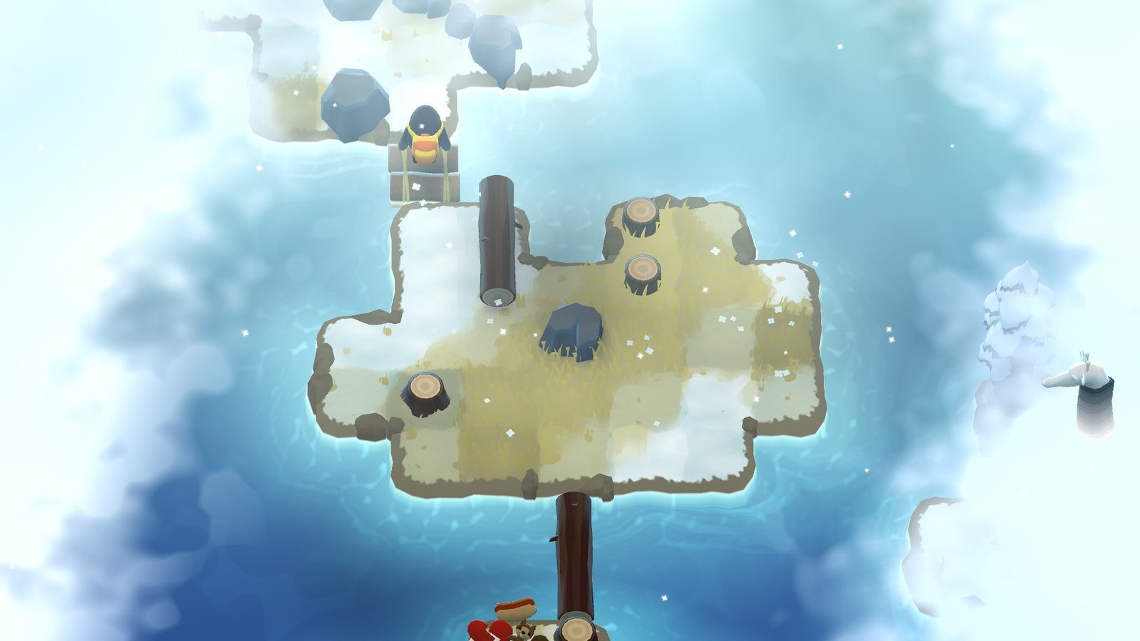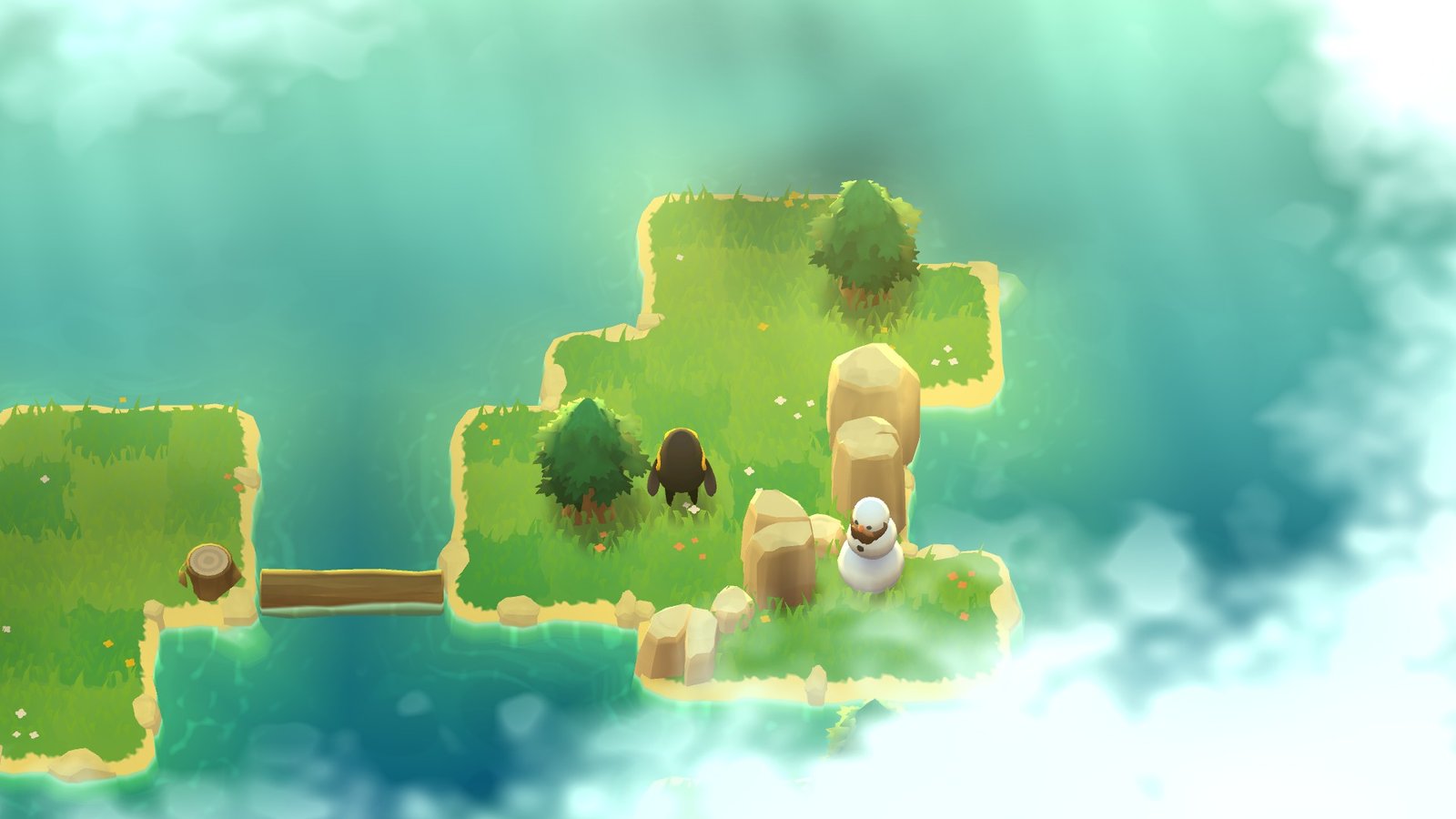 Pour permettre d’atteindre les différentes iles, un postulat de base très simple est proposé : il vous est possible de frapper les arbres pour les faire tomber sous forme de rondin. Ensuite, il va falloir les pousser ou les faire rouler, en fonction de leur position. Mais l’explication va s’arrêter là : non pas que A Monster’s Expedition manque de mécaniques de jeu, bien au contraire, mais parce qu’il va réussir à vous les faire découvrir et vous apprendre à vous servir de votre environnement et de ces rondins de bois d’une bonne dizaine de façons… sans jamais une seule ligne de texte.