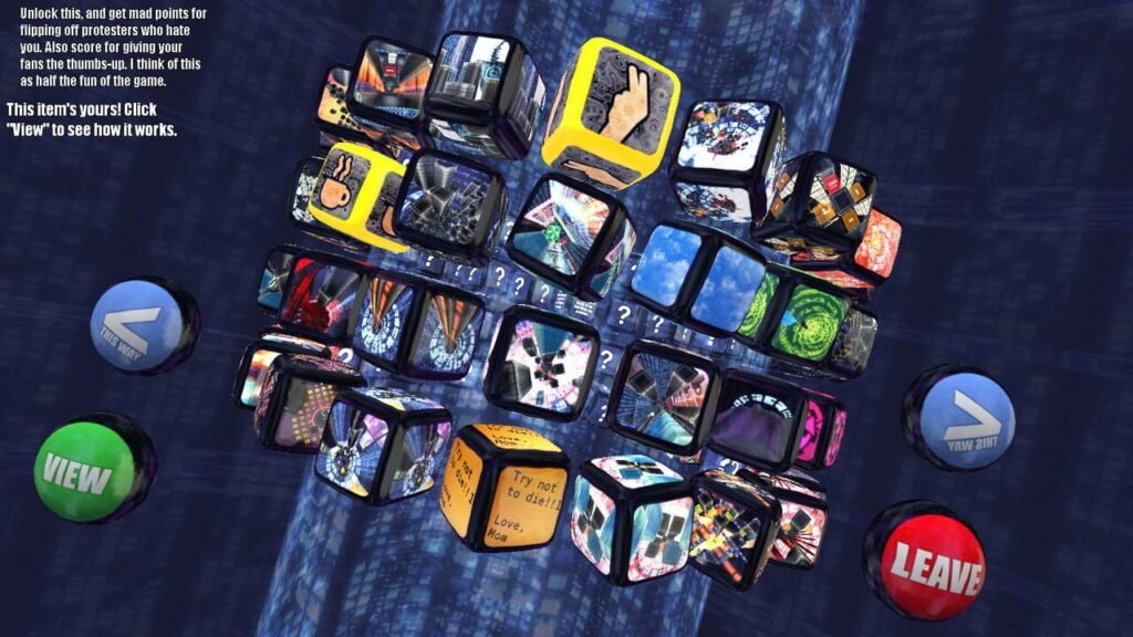 sans parler de cet incroyable tableau de choix des niveaux ? Chacun présenté par un écran de télévision, collés les uns aux autres pour créer une sphère navigable avec les boutons fléchés disposés à gauche et à droite de l’écran, les niveaux ne sont cependant pas tous débloqués en début de jeu. En plus d’un score sur cinq étoiles qui permet d’entrer (ou non) dans le classement mondial, chaque niveau réussi offre un nombre de « dents ». Ces dents sont une sorte de monnaie d’échange permettant d’acheter les niveaux annexes à ceux déjà débloqués. Ainsi il est impossible d’aller piocher n’importe quel niveau au hasard dans la grande sphère proposée : il faudra terminer un des niveaux adjacents à celui-ci pour le débloquer et pouvoir l’acheter. En plus des niveaux de jeu, on retrouve aussi des tutoriaux venus débloquer les actions précédemment citées. Plus curieux encore : certains écrans affichent des indices qui, une fois cliqués, font apparaitre une phrase plus ou moins sensée sur la vie, le monde et tout le reste. Bref, les développeurs s’en donnent à coeur joie et ce ne sont pas ces rares, mais hilarants écrans de messages sonores offrant un cours zen, une recette de grand-mère et autres bêtises à déguster sans modération pour peu que l’on ne soit pas anglophobes, qui me feront mentir.