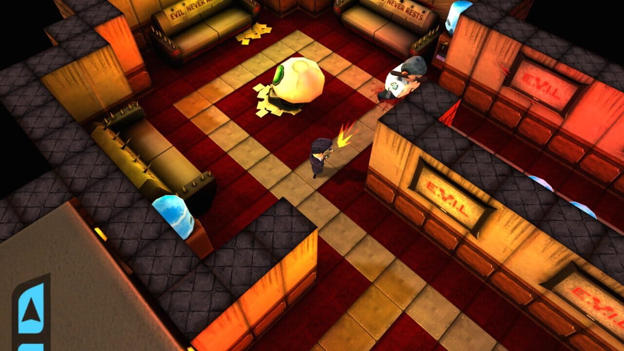 Pas facile d’être agent secret quand la plus grande multinationale est le QG des méchants. Vous infiltrez alors la grande tour, d’étage en étage, en essayant à chaque niveau d’atteindre un protagoniste en particulier. Le jeu est en semi-vue de haut, fenêtré (le plein écran existe avec Alt + Tab mais est légèrement mal adapté à Steam) et vous voyez votre protagoniste avancer tout seul vers le prochain couloir. D’un coup de Tabulation, vous entrez sur la carte et pouvez cliquer sur des points de passage pour indiquer quel chemin doit prendre l’Agent Awesome. Il vous suivra sans réfléchir. Certains points affichés en jaune sont les ennemis. Ceux-ci vous tirent dessus/vous frapperont dès qu’ils vous verront, s’enchaînera alors un jeu du « chacun son tour » en terme d’attaque. Vous avez une barre de vie, eux aussi. Le premier à terre a perdu. Cependant, si vous réussissez à les atteindre de dos, ils ne vous verront pas et pourront être abattus sans prendre un seul point de dégâts. Autre chose très sympathique : l’arsenal, que l’on débloque au fil des rares points que l’on obtient après une mission. Allant du simple pistolet à des grenades, des mines ou même et surtout une « corde de piano » pour étrangler silencieusement, tout est bon pour jouer efficacement. Toujours contre des points, vous pourrez améliorer ces armes pour que, par exemple, votre pistolet bénéficie de plus de munitions, d’une plus large zone d’effet, etc.