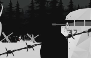 Autant le joueur était transporté dans un monde étrange et horrifique dans Limbo, autant il reste plus dans un monde pseudo-réel dans Albert and Otto. L’ambiance qui se dégage des environnements est plus celle d’une guerre ( chants militaires, chars, barbelés ) et on ne veut pas faire polémique mais il est vrai qu’une certaine ambiance « IIIe Reich » est perceptible. Le choix des couleurs noires, blanches et rouges, la police gothique, les traits secs et durs, les noms à consonance allemande des personnages et sur les plaques de rues, la forme du « & » du titre, il nous est impossible de ne pas faire le rapprochement. C’est plutôt bien vu et je ne trouve pas ce choix artistique choquant, combien de jeux vidéo avec des nazis existent ? Une bonne pelletée, pas de quoi stigmatiser ce jeu-là.