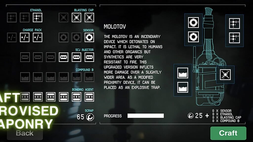 Amanda Ripley est donc ingénieur. L’excuse est bonne pour lui permettre de bricoler pas mal d’objets qui ne seront pas nécessairement létales, mais lui serviront de diversion quand cela s’avèrera nécessaire. Parmi son inventaire, on comptera des grenades éblouissantes ou des fumigènes fait maison, des appareils produisant des sons stridents afin d’attirer l’alien ailleurs que dans votre direction et j’en passe. Chacun des ces items utilisés stratégiquement viendra rallonger votre courte durée de vie. Néanmoins, vous ne les trouverez pas prêt à l’emploi comme ça. Il faudra explorer un peu, fouiller des caisses, histoire de récolter de quoi vous fabriquer cela.