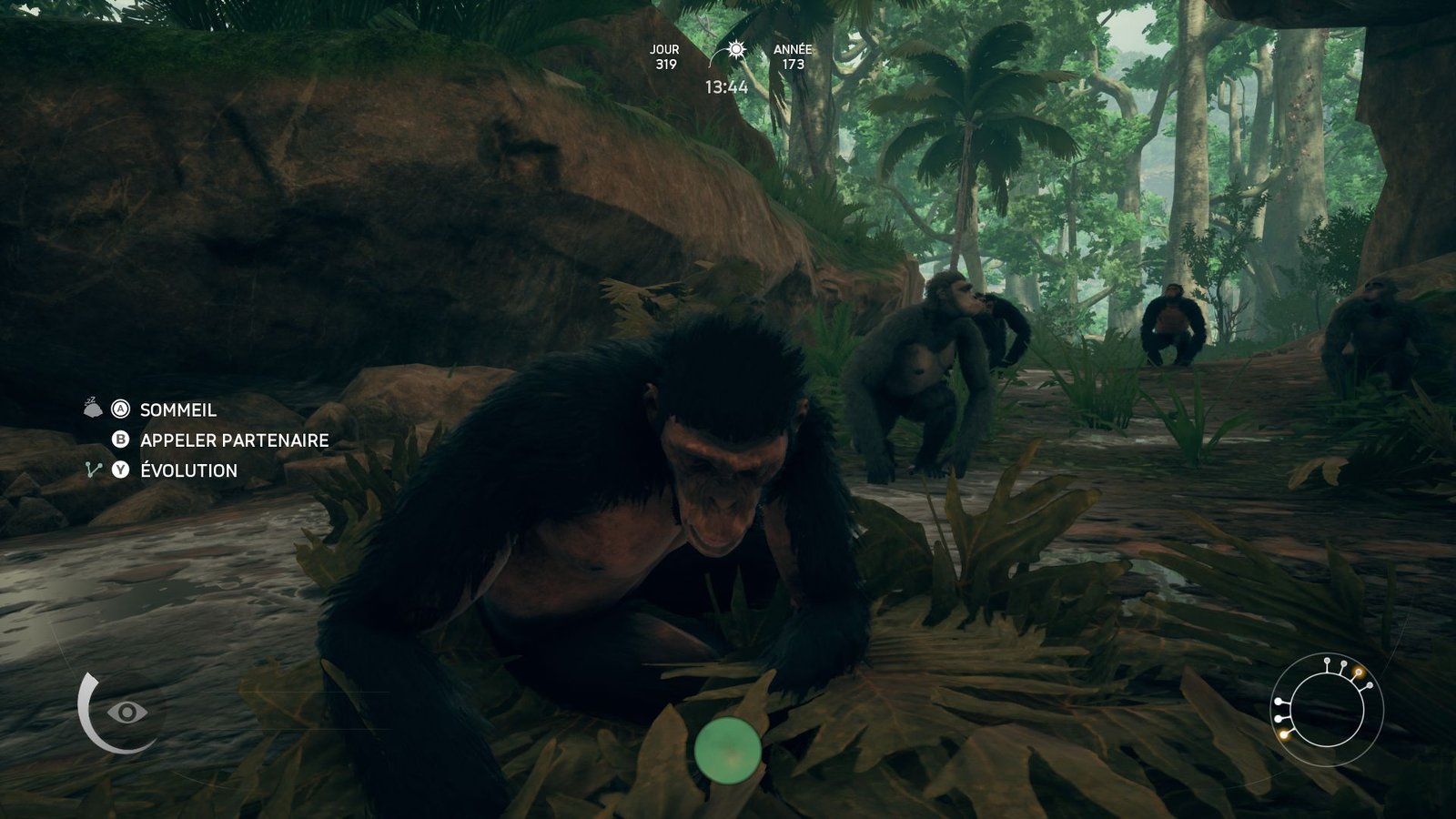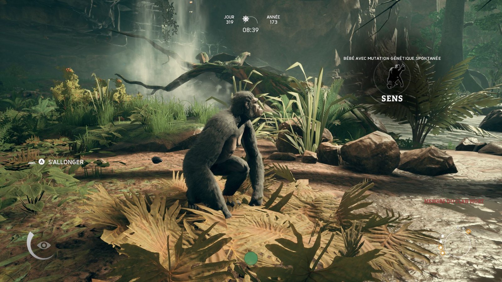 Tout commence au bord d’une cascade : vous êtes l’un des membres d’un clan de singes bien installé qui se contente de dormir, boire de l’eau, manger quelques baies et ne surtout pas s’approcher du bord. Mais vous êtes un intrépide et vous apprendrez dans la douleur que sauter d’un arbre à un autre demande de la dextérité… Ce que vous n’avez pas vraiment en début de jeu. Les pas sont lourds, les mouvements patauds, mais la découverte du biome proposé dans Ancestors est tout de même ravissante. On découvre avec bonheur cette jungle dépaysante nous plaçant dix millions d’années en arrière. Mais la découverte est brutale : Ancestors fait partie de ces jeux qui ne vont pratiquement rien vous expliquer.