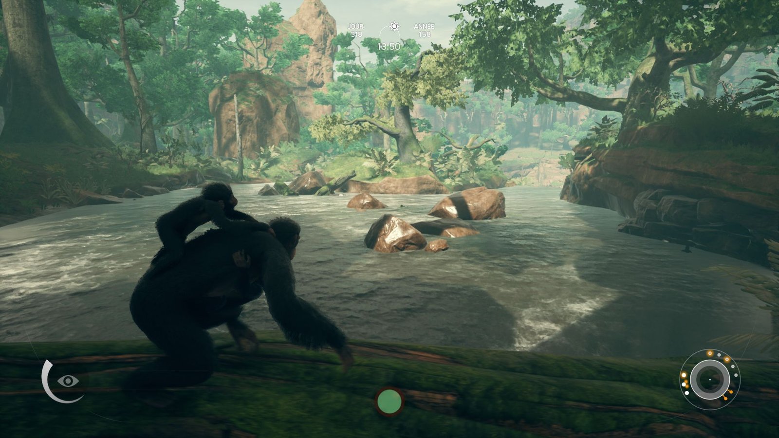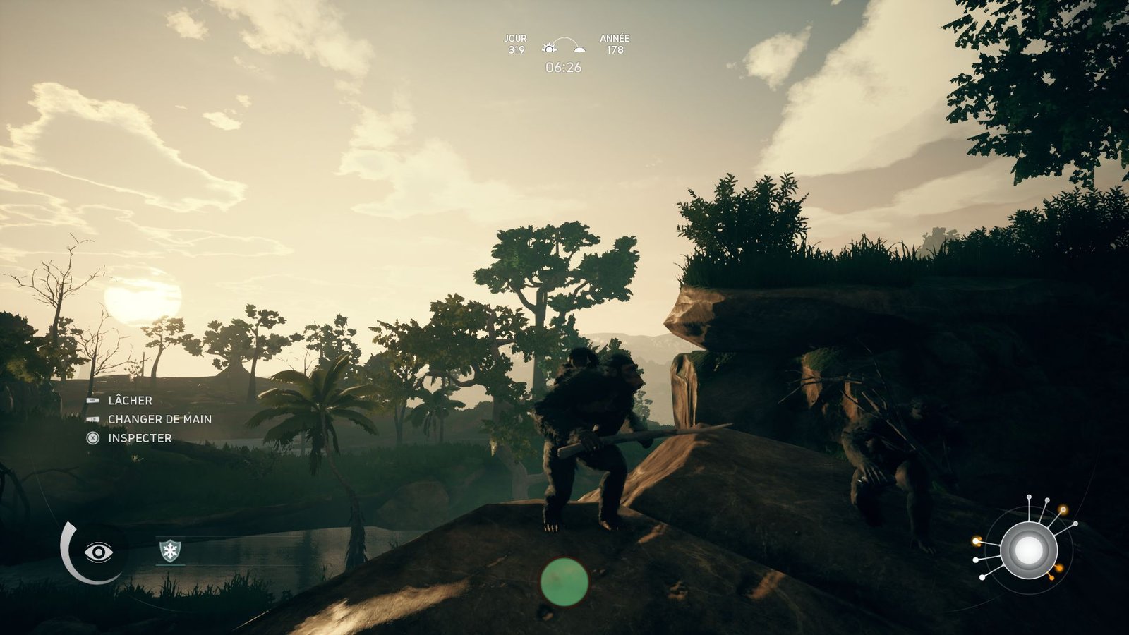 Ces compétences sont liées à plusieurs « thématiques ». Tout d’abord la digestion des aliments, comme précisé précédemment, mais aussi l’exploration. Dans Ancestors, le monde entier est inconnu et aucune carte ne vient vous aider. La cartographie, ce sera vos souvenirs et vos points de repères. Tout ce qui peut entrer en interaction avec votre singe sera indiqué à l’écran lors de l’utilisation d’une vie spécifique, permettant de switcher entre trois sens : la vue, l’odeur et l’ouïe. Ainsi vous découvrirez la faune, la flore, l’eau, les pierres, mais aussi des points d’intérêt qui permettent, en plus de proposer de jolis panoramas, de débloquer d’autres camps peut-être plus intéressants pour progresser. Un conseil, attendez d’être bien évolué pour commencer à partir à l’aventure. L’attaque d’un tigre est si vite arrivée.