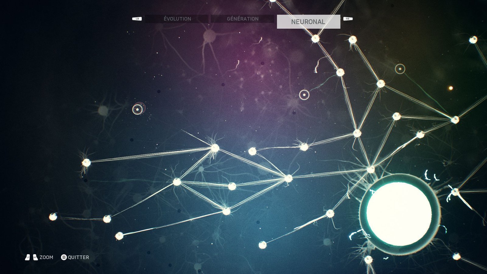 Une jauge neuronale est indiquée à l’écran et augmente à chaque fois que vous effectuez une action particulière, les nouvelles et celles en phase d’apprentissage vous récompensant davantage. Avec cette jauge neuronale, vous pourrez vous rendre dans la première étape de l’évolution : le système neuronal. C’est ici que les neurones sont liés. En cours de jeu, à force d’effectuer certaines actions, vous débloquerez l’accès à des neurones spécifiques améliorant votre clan. Il vous faut d’abord « acheter » un neurone dévoilé avec un peu de votre jauge neuronale pour pouvoir le débloquer, puis encore dépenser de votre flux bien acquis pour activer le chemin jusqu’à ce neurone et en obtenir les compétences.