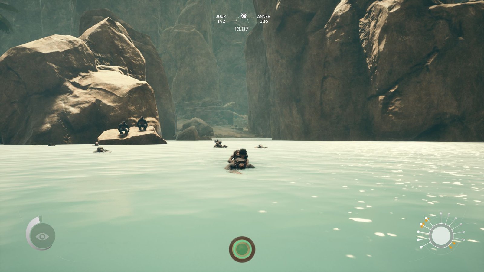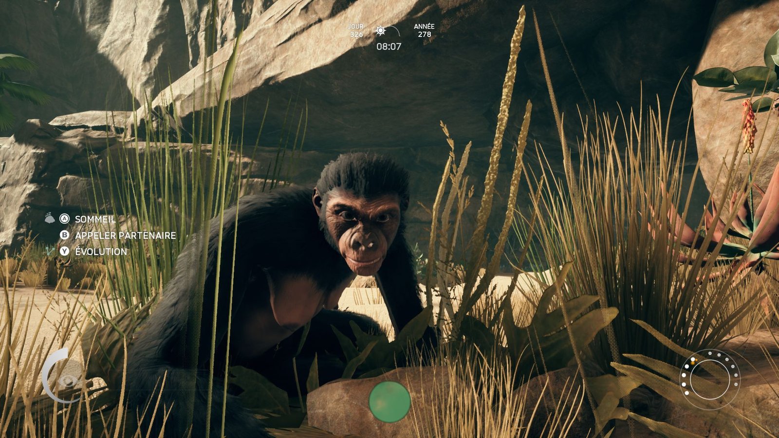 Certains tutoriaux apparaîtront, si vous les avez activés, dès qu’une action sera à votre portée mais concrètement, Ancestors peut vous laisser jouer une dizaine d’heures sans que vous ayez compris une seule de ses idées de gameplayOu « jouabilité » en français, fait référence à la façon dont le joueur interagit avec un jeu vidéo. ou possibilités de progression. L’idée est simple : vous demander de progresser dans un monde où rien ne vous tombe dans les mains et où il vous faut apprendre réellement, en tant que joueur comme en tant que singe. Cela débute par les commandes, encore contextualisées et montrées à l’écran pour les plus simples. Mais rapidement, la barrière de l’inconnu vous picore les neurones. Approchez d’un quelconque objet pouvant être considéré comme un outil, d’une quelconque plante ou autre comestible, et une brune noirâtre et inquiétante l’entourera. Il vous faut l’identifier : laisser le temps à votre singe d’être certain que cela ne va pas lui causer du tort. Bref, appréhender les choses et se rassurer.
