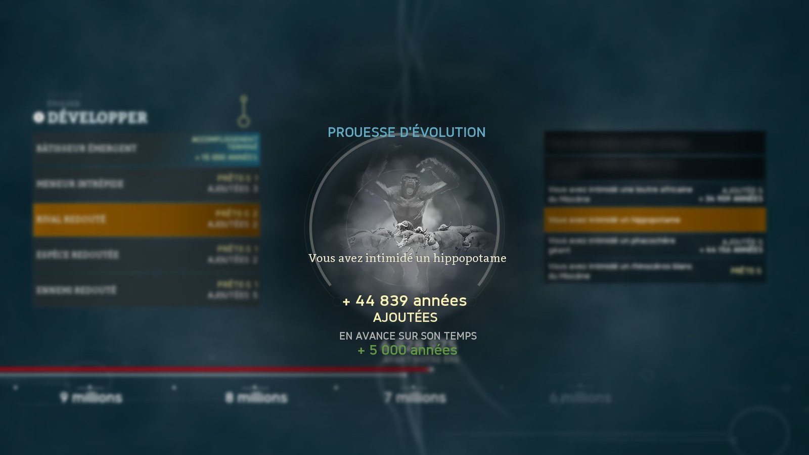 Tout ce que vous découvrez, combattez, combinez, explorez, réalisez, répétez, a de fortes chances d’avoir son « objectif » attitré dans le menu de l’Évolution. Voyez cela comme des succès/trophées/achievements/réalisations dans les autres jeux. C’est un peu grossier et en début de partie, on n’y prête pas vraiment attention. Pourtant, ils ont un intérêt capital : ce sont eux qui vous permettront, une fois un camp établi, quelques neurones validés et des bébés en pleine forme, de faire évoluer l’espèce de façon définitive. C’est la troisième et dernière étape évolutive d’Ancestors.