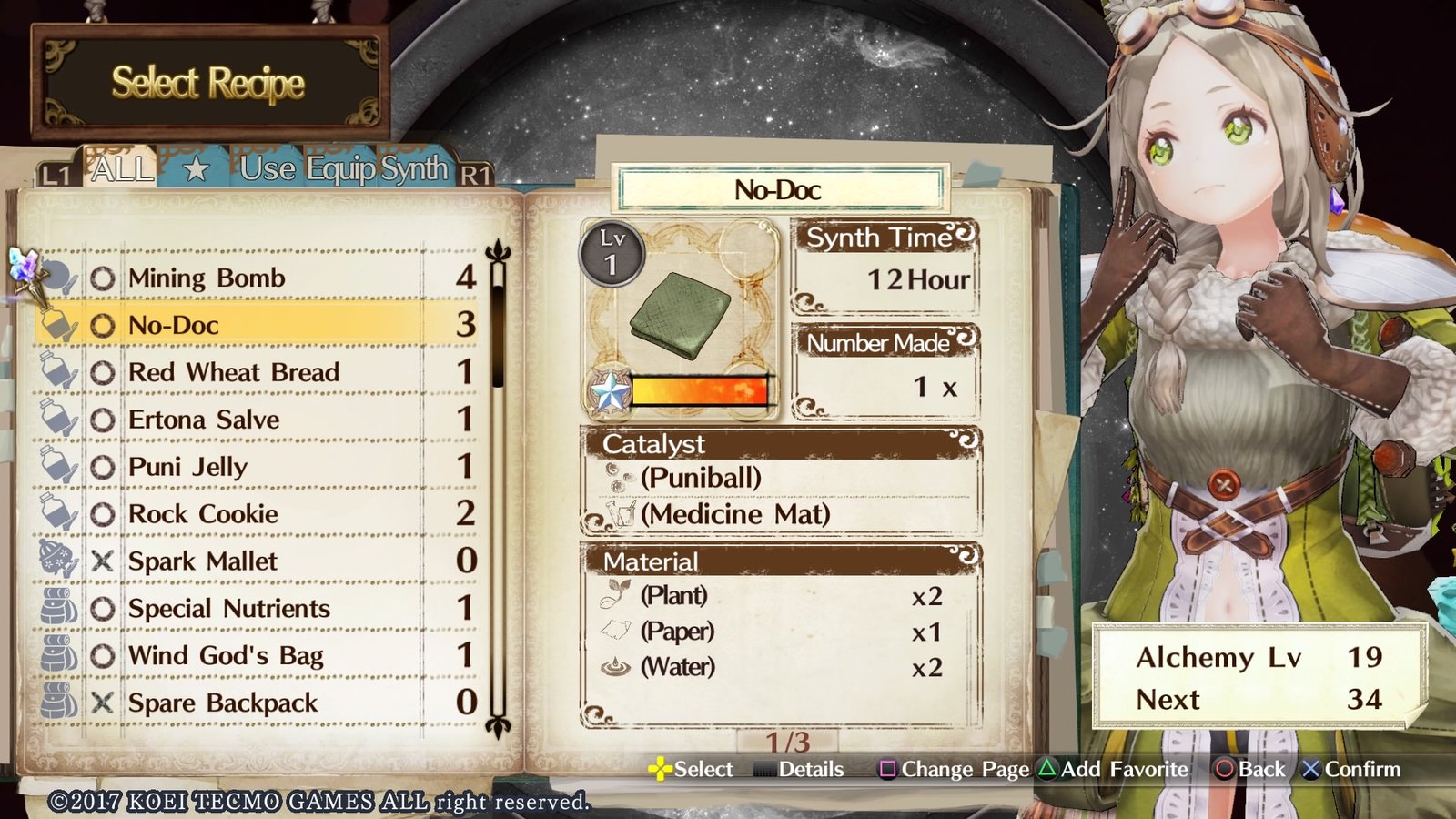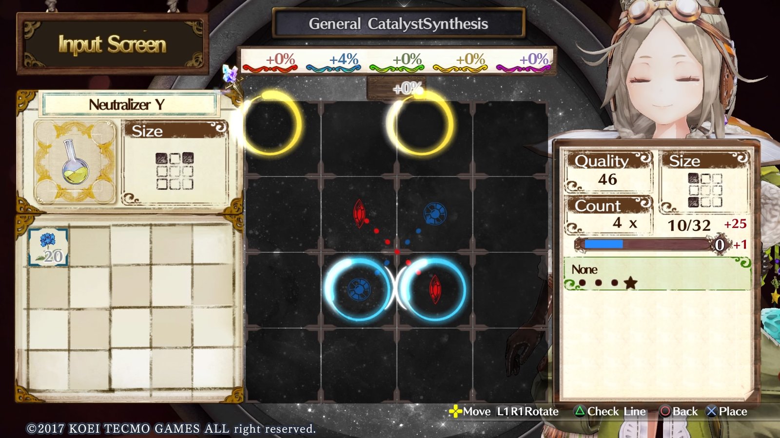 Pour le reste, les bases sont les mêmes qu’auparavant : nous avons un atelier principal (cette fois-ci mobile, façon « tente Quechua » à chaque feu de camp) qui nous permet de stocker tous les ingrédients que l’on ramasse. Un chaudron permet de créer des objets en fonction des ingrédients disponibles, du niveau d’Alchimiste de l’héroïne (à ne pas confondre avec le niveau des phases de combat) . A la préparation, une fois les ingrédients sélectionnés, on peut tenter d’en améliorer la qualité et les spécificités en choisissant un catalyseur spécifique : celui-ci affichera une grille, faite de points précis, colorés ou non. Sur ces points, il va falloir poser les ingrédients, tous liés à une forme et couleur spécifique. On a le droit au final à un petit puzzle-game sympathique nous permettant soit de l’esquiver (et donc obtenir un objet « classique ») soit de le maîtriser et se voir récompensé du même objet mais d’une qualité d’exception. Cela améliore son utilisation (pour les bombes au combat, par exemple) mais aussi son prix de vente.