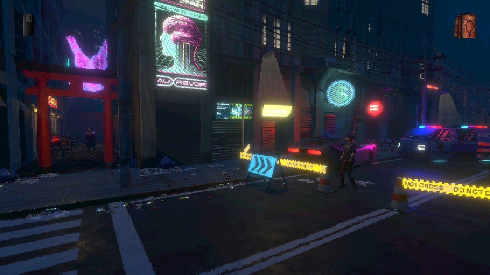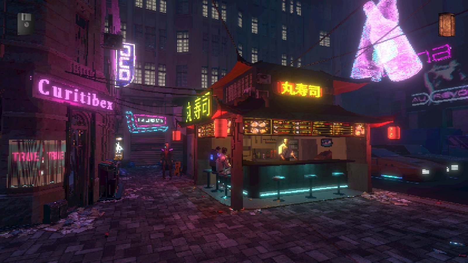 Vous l’aurez compris, en voyant les quelques captures d’écran illustrant cette critique, Au Revoir est un Point & Click en 3D fortement pixelisée, rappelant très fortement le jeu Blade Runner de Westwood Studio sorti en 1997. Graphiquement, c’est d’ailleurs vraiment réussi pour peu que l’on apprécie le style, et un vrai plus du titre. Les environnements sont soignés, avec beaucoup de détails, même si on aurait tout de même aimé avoir la possibilité de cacher les icônes de menu et d’inventaire, ou au moins de pouvoir faire en sorte qu’elles ne soient pas en constante rotation, ce qui attire un peu trop le regard. On sent bien en tout cas la volonté de recréer l’atmosphère d’un titre comme Blade Runner, jusque dans la musique. Si celle-ci est plutôt en retrait, avec pas mal de moment sans, leurs présences viennent, elles aussi, rappeler la fantastique BO de Vangelis et ses synthés.