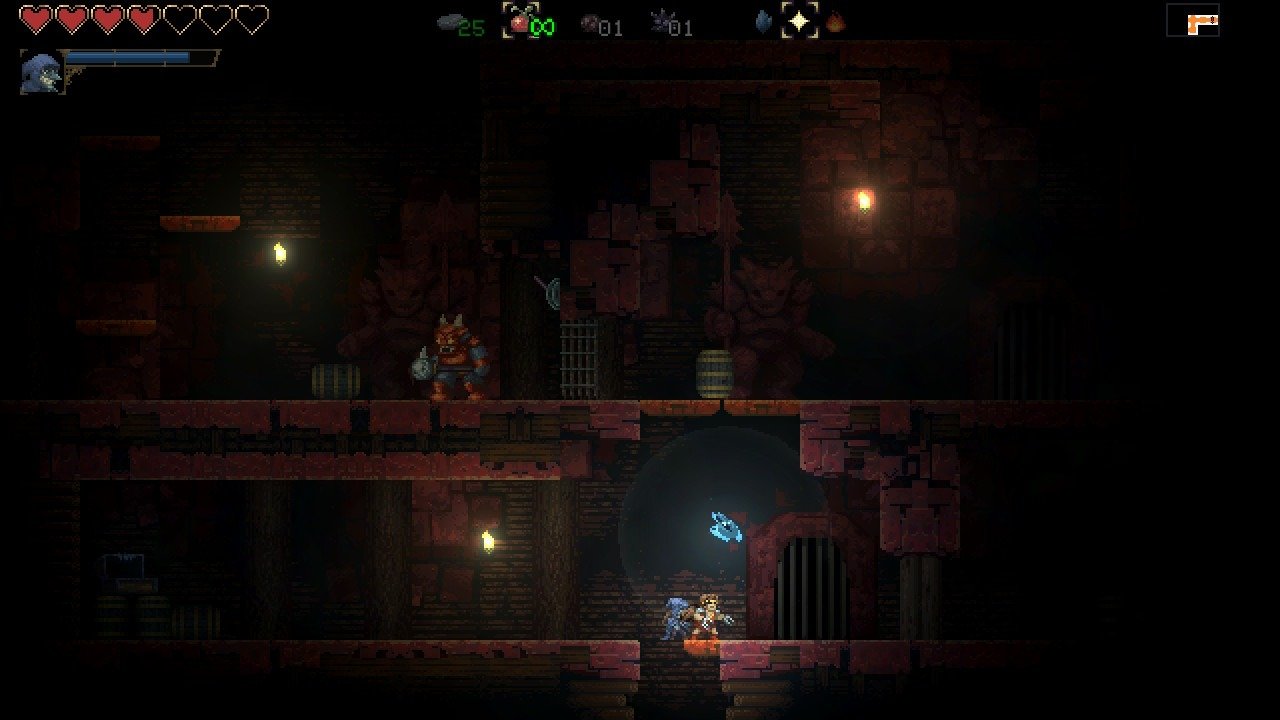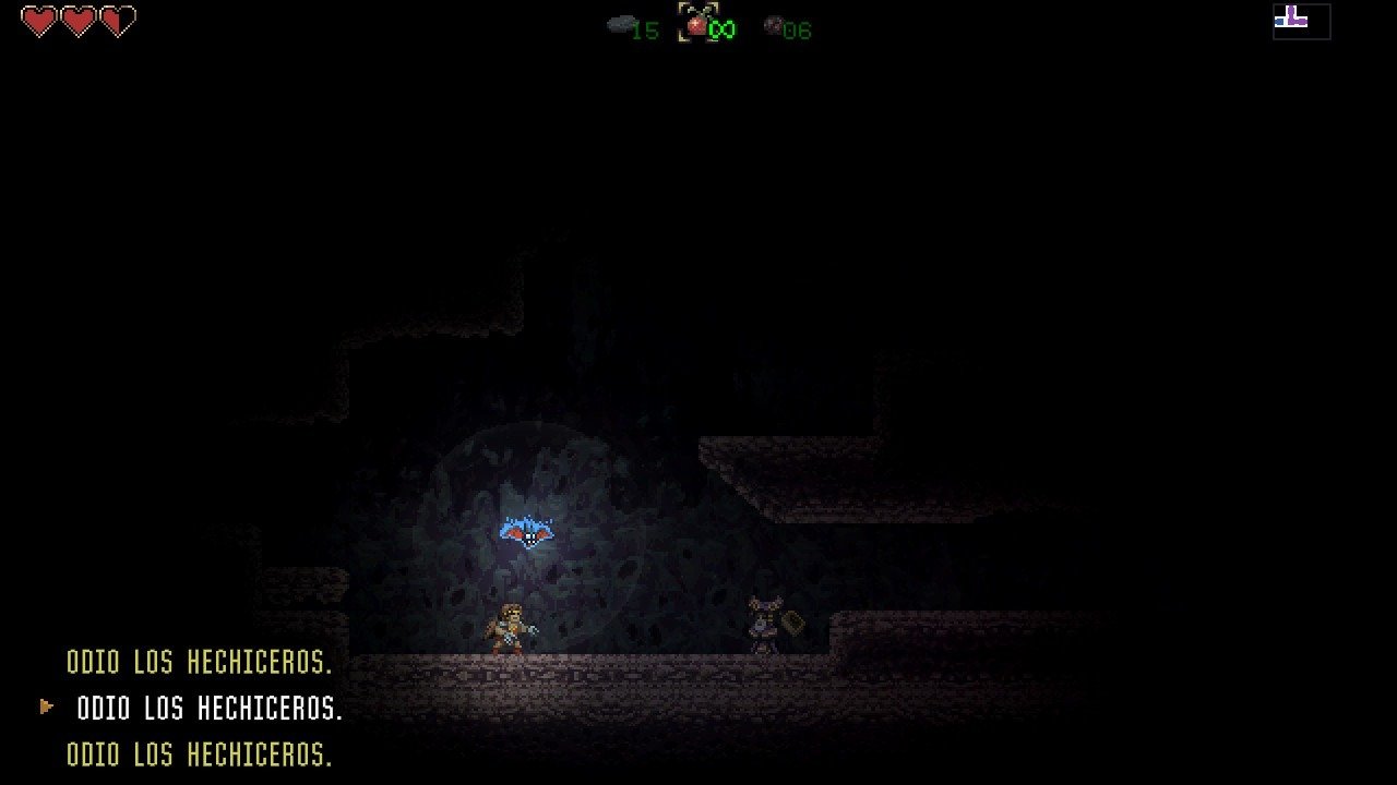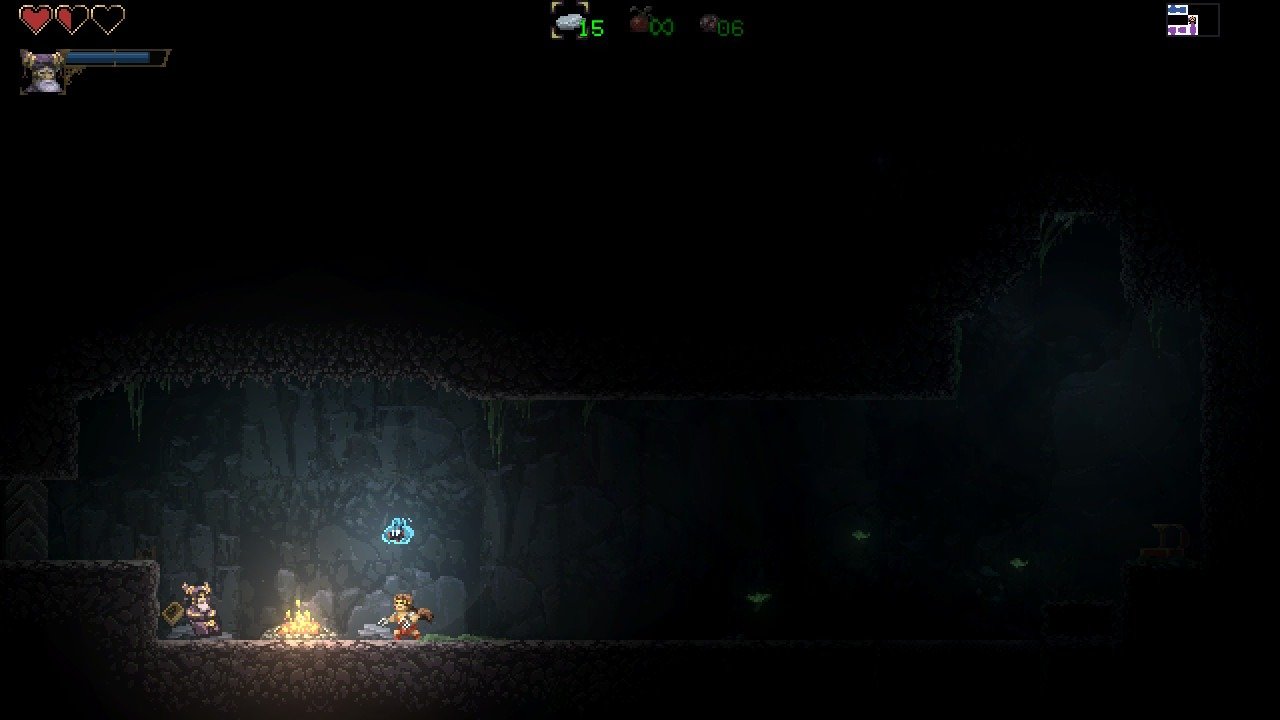 Aux commandes d’un.e barbare, nous devrons parcourir une grotte sombre dans laquelle nous avons malencontreusement chuté. Heureusement pour notre héros.ine, nous sommes accompagné d’une chauve-souris magique (ne lui dites pas, les barbares ont horreur de la magie) qui éclaire un peu les environs. Il faudra jouer avec les divers fruits pour déplacer Pip ( c’est son petit nom ) afin d’éclairer les alentours et comprendre comment passer chaque écran, et aussi de se servir de la lueur qu’émettent les ennemis pour trouver son chemin. Il sera évidemment question d’interrupteurs à actionner, de piquants et autres liquides mortels à éviter, tout ça dans la pénombre la plus profonde. Est-ce que ça fonctionne ? Presque.