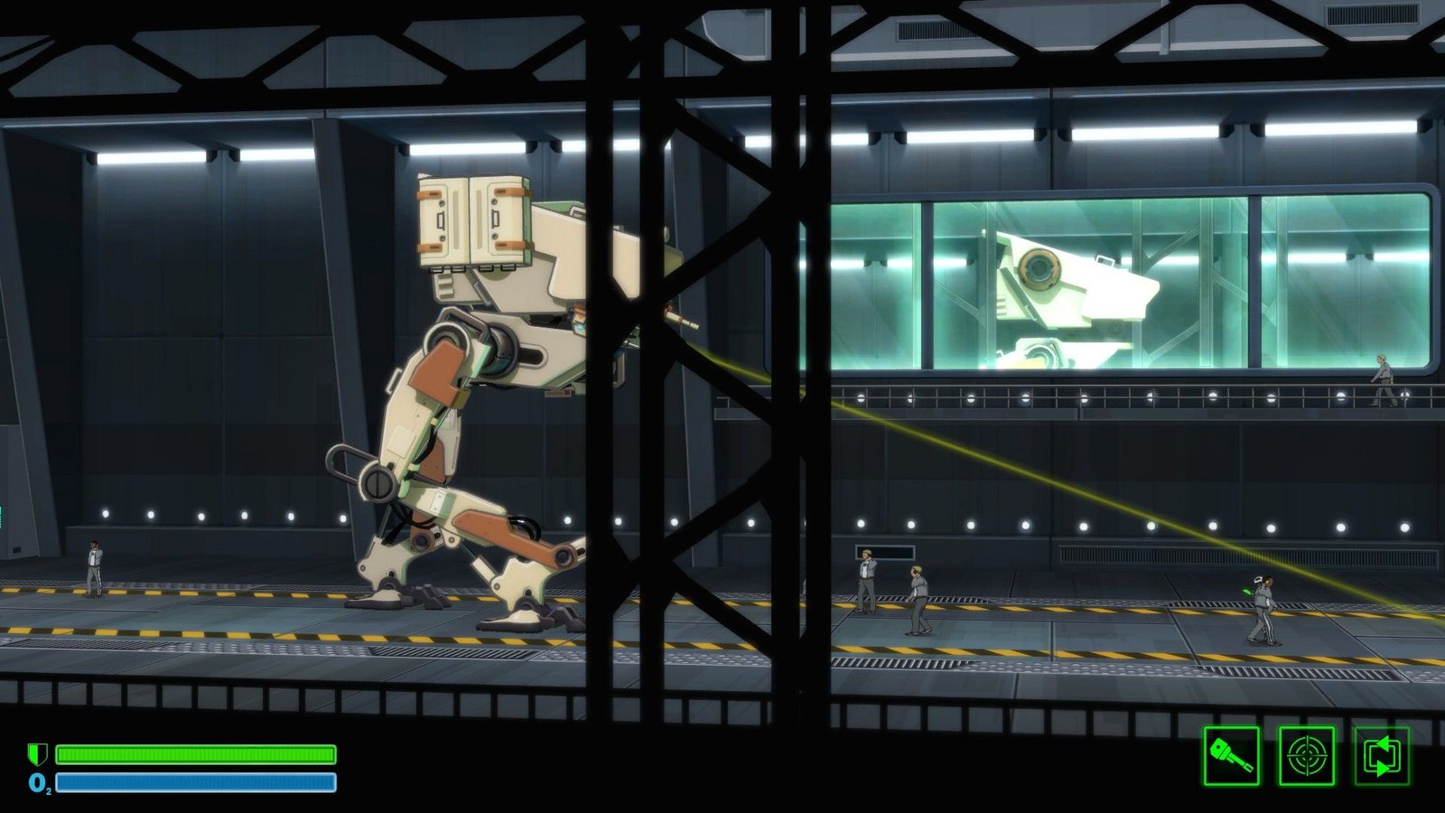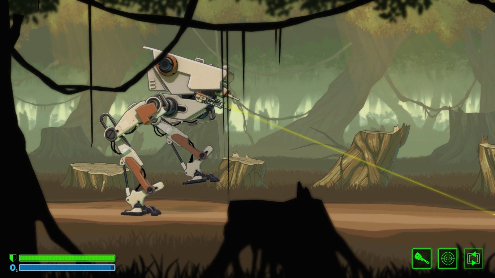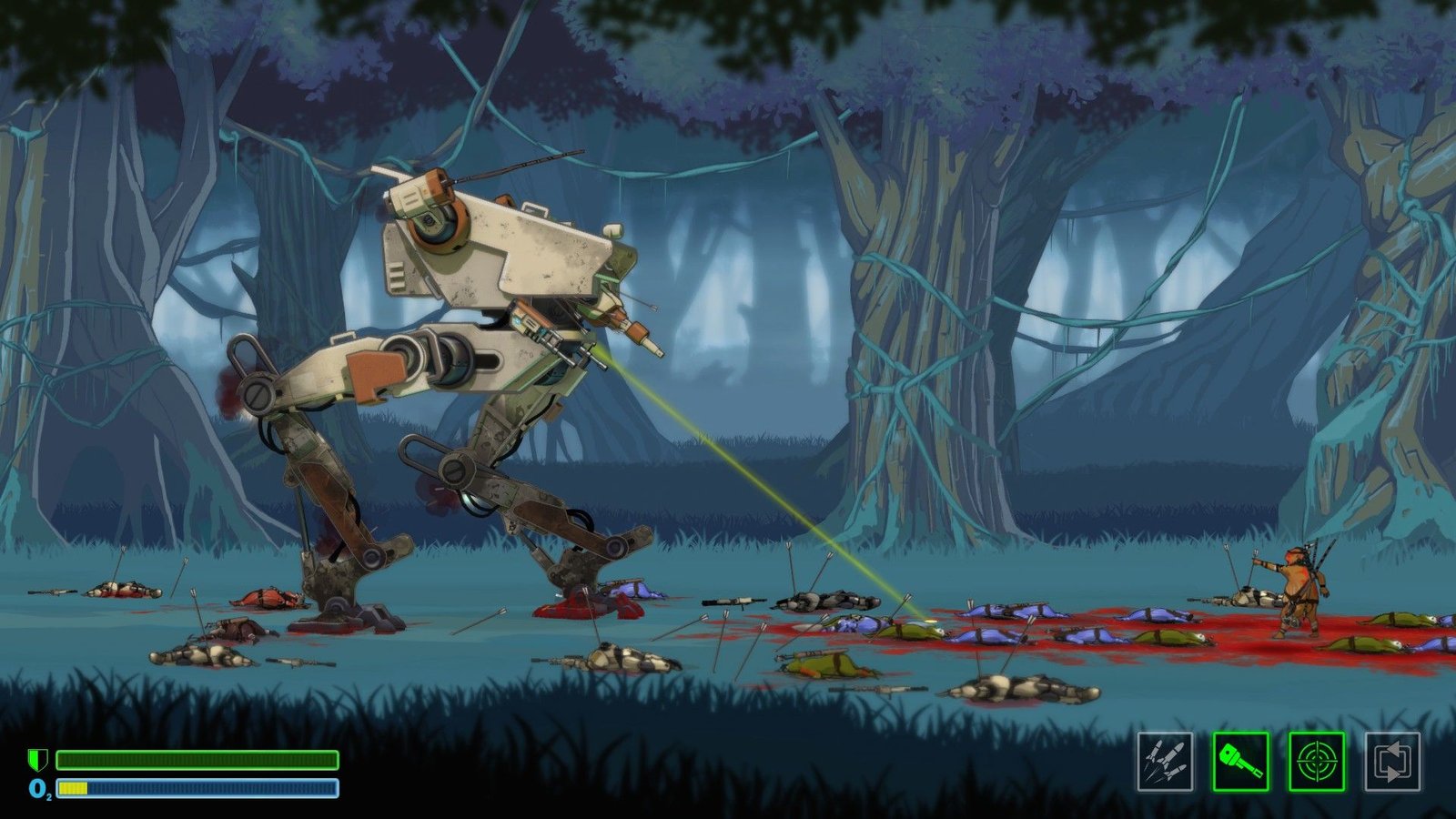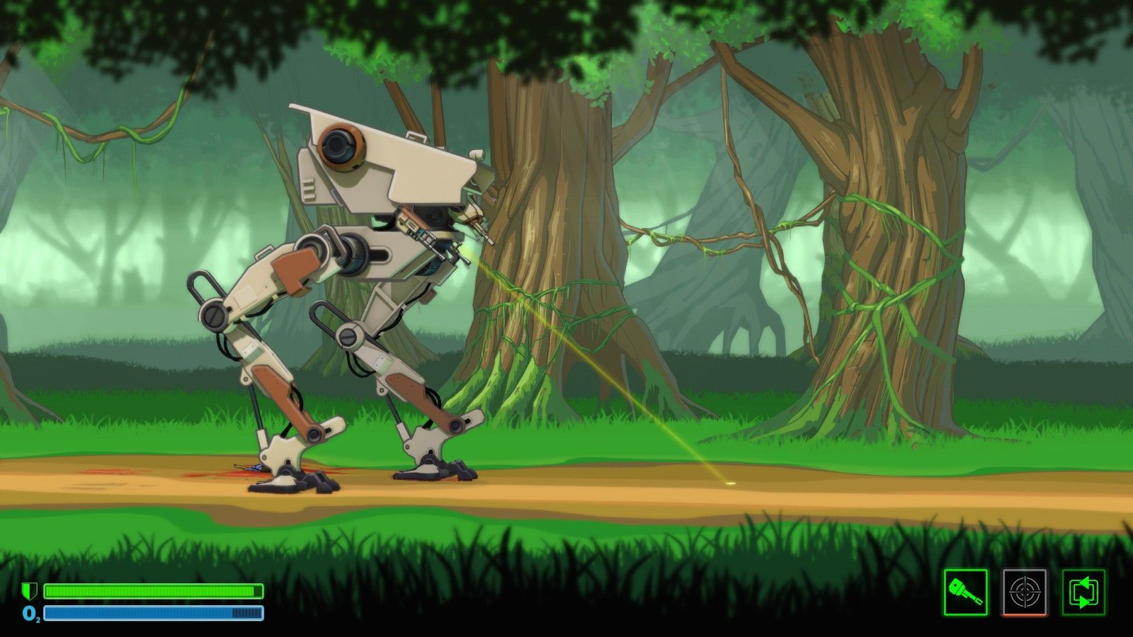 Dans le principe pourtant ça aurait pu bien tourner. En effet, un jeu à la Walker sur Amiga où on se balade sur un plan en 2D de gauche à droite, en tirant sur des cibles et en évitant des tirs, un genre de shooter un peu plus lent que d’habitude c’est pas idiot. Soit. Alors Ok mais pour rendre le jeu vraiment inoubliable il a fallu ajouter un truc, le high concept le plus pété possible : manipuler chaque jambe indépendamment. Il va donc falloir, un peu comme dans Qwop, un jeu flash très drôle (essayez-le tant que c’est possible) lever la jambe gauche, avancer, poser la jambe gauche, lever la jambe droite, etc. C’est ultra lent, ultra lourd, et évidemment ultra pas précis et pas très amusant. À cela s’ajoute un système d’armement conçu on ne sait trop comment et probablement en dépit du bon sens. Les armes principales surchauffent très vite, tirent en alternance sur les deux lignes avant et arrière (où se situent les ennemis et obstacles éventuels, mines,etc) et les armes secondaires souffrent d’un cooldownTemps d'attente nécessaire avant de pouvoir réutiliser une compétence, une action ou un objet. très long. Ce qui fait qu’en réalité on passe plus de temps à marcher sur les ennemis qu’à leur tirer dessus. D’autant qu’ils débarquent aussi derrière le robot et que celui-ci ne peut tirer que devant lui. Vu le fun procuré par ce mode de déplacement je vous jure qu’on se tape des barres de rire à tout bout de champ (non).