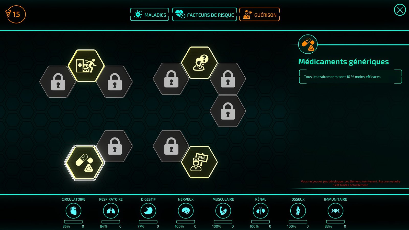 Si vous êtes de ceux qui ont déjà pratiqué de la Biochimie et savent différencier une membrane d’une paroi, alors vous allez beaucoup rire au début, beaucoup pleurer au fil des parties. Surtout quand Bio. Inc va commencer à balancer des informations totalement fausses et dangereuses à la tête des joueurs, comme sur ce screenshot ci-dessus qui stipule que « les médicaments génériques sont moins efficaces de 10% ». Ce qui est un énorme et dangereux mensonge… Les développeurs ont été contactés, nous leur avons expliqué le souci et nous n’avons toujours aucune réponse de leur part. Vérifier leurs informations ne semble pas être leur priorité.