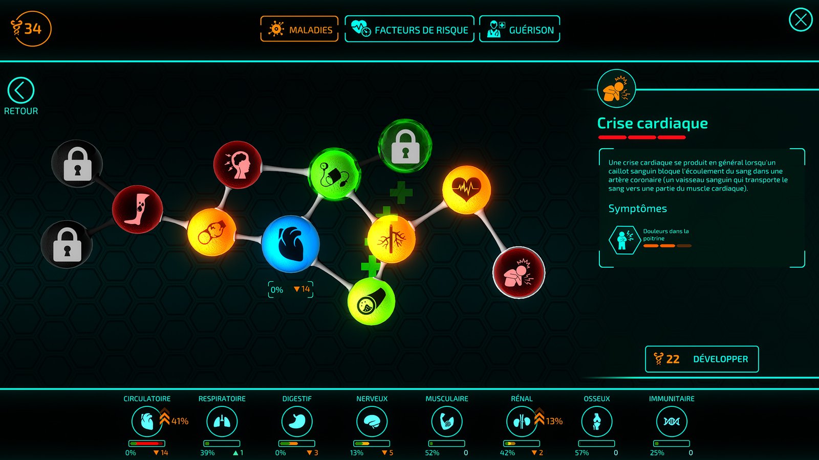 Comme pour Plague, Bio. Inc est absolument faussé de partout médicalement parlant, scientifiquement parlant. Ce n’est pas un jeu réaliste malgré ses visuels, sa façon de se présenter, ses musiques, etc. C’est un pur jeu ou l’on clique sur des icônes et on attend de voir quels effets ils auront sur la suite de la partie. On collecte, on dépense, on regarde, puis on recommence. C’est très prenant, complètement chronophage, sauf si vous êtes un tant soit peu informé sur la médecine et les sciences.