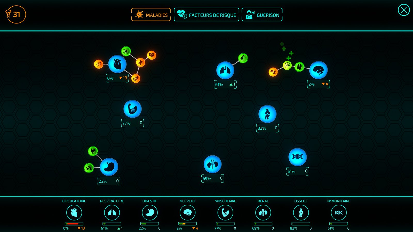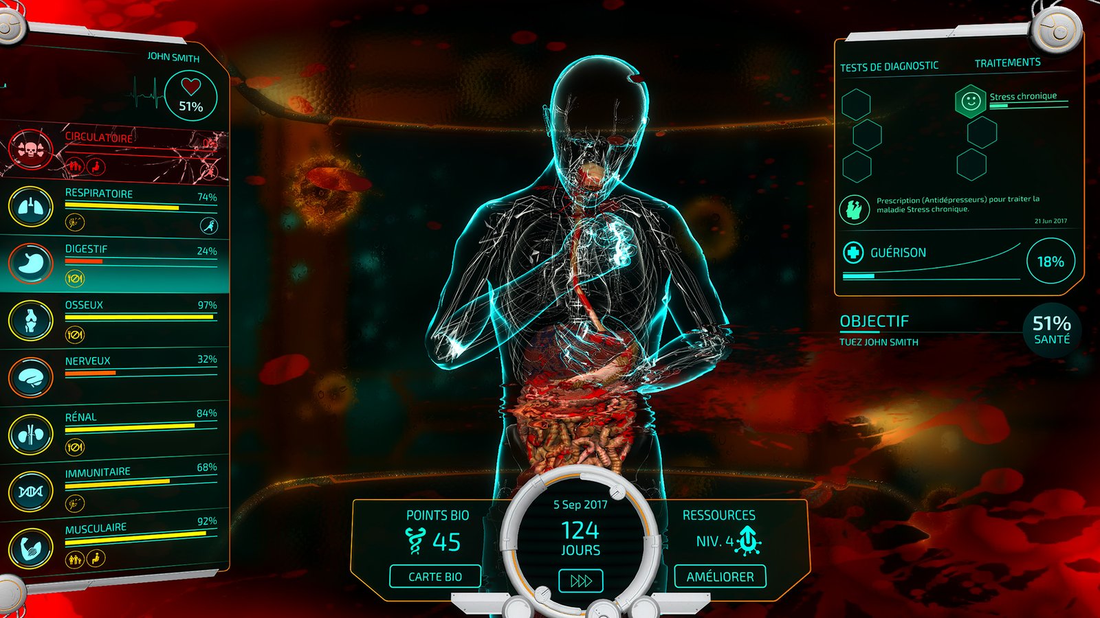 Le jeu se base sur un pourcentage de guérison qui doit atteindre 100% pour une réussite finale. Le temps est alors contre vous car les différents organes du patient peuvent lacher et perdent en force au fil de la partie. Plus vous attendez pour diagnostiquer un problème, plus l’intelligence artificielle qui se bat contre vous débloquera d’autres symptômes et maladies. Par exemple, j’ai réussi à sauver mon patient d’un cancer à 90% de guérison, mais il est mort à cause d’un rhume que je n’avais pas pris le temps de soigner. C’est stupide ? C’est les aléas du gameplayOu « jouabilité » en français, fait référence à la façon dont le joueur interagit avec un jeu vidéo. de Bio. Inc Redemption.