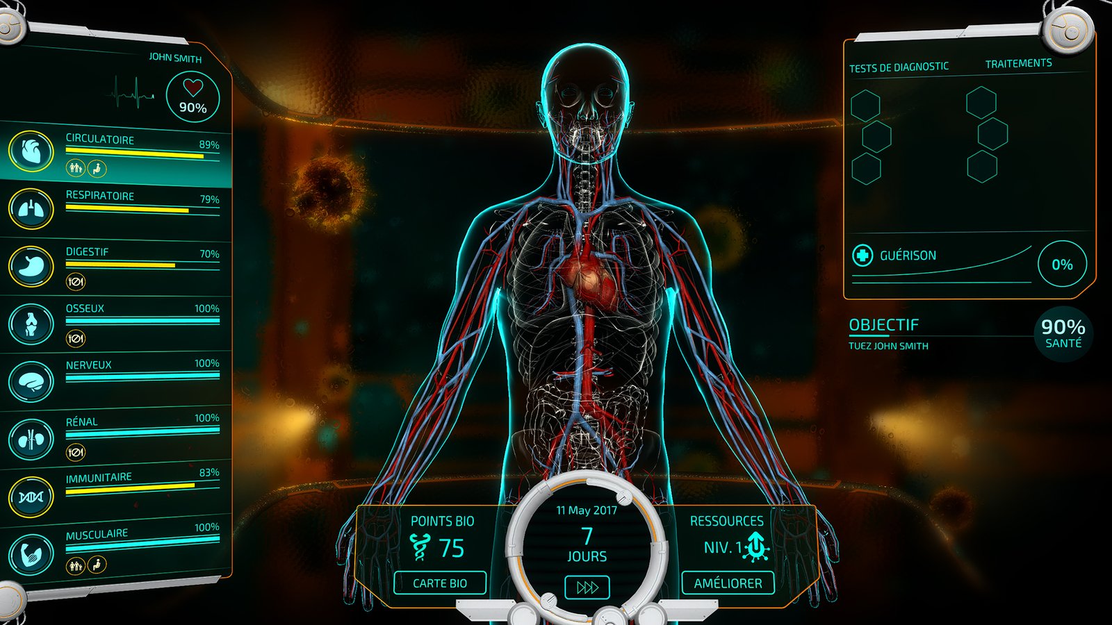 Imaginons que vous n’ayez jamais joué à Plague et expliquons un peu le concept de Bio. Inc Redemption. L’idée est simple : vous avez devant vous un corps humain, que vous pouvez analyser sous plusieurs formes : circulatoire, respiratoire, digestif, osseux, rénal, nerveux, immunitaire et musculaire. Chacune de ses formes verra quelques cellules apparaître, que vous devrez collecter à la souris pour augmenter vos points BIO. Ces points vous permettront alors d’acheter des tests de diagnostics et des traitements pour tenter de trouver quelle est la maladie du corps que vous explorez et quels en sont les remèdes.