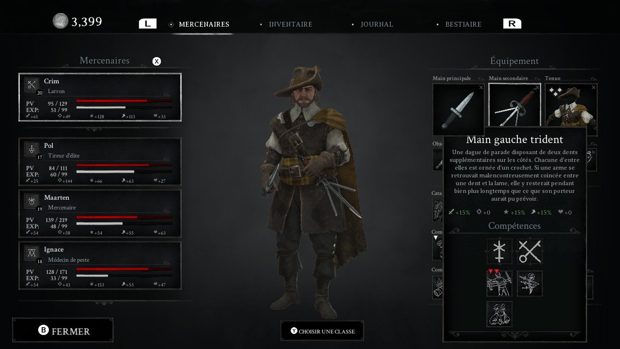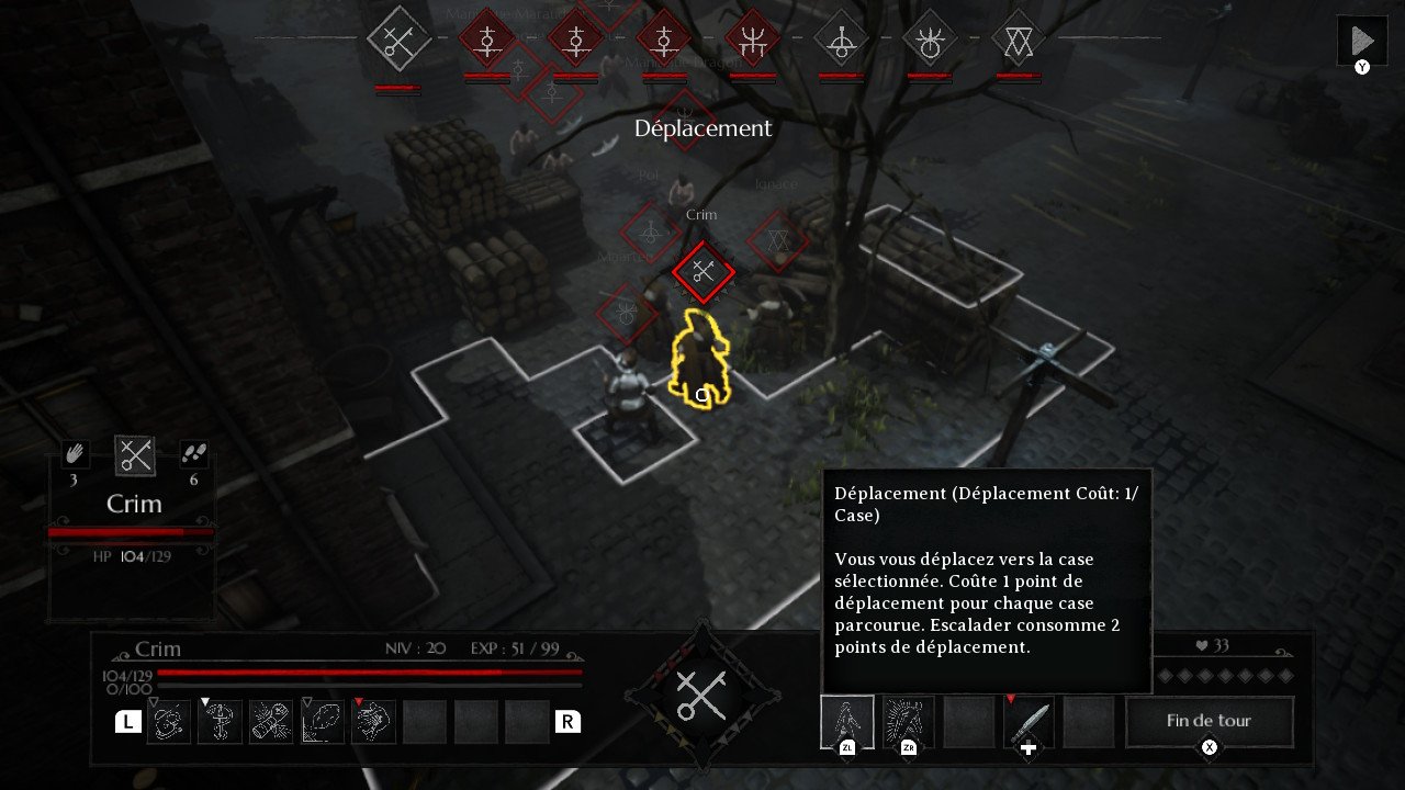 Clairement dans la veine de Final Fantasy Tactics dans ses mécaniques, le jeu nécessite une bonne gestion des placements puisque les attaques de flanc et par derrière font bien plus de dégâts que les attaques frontales. Il en reprend aussi le gain de compétences via les armes utilisées qui permettront de débloquer de nouvelles classes. Il sera possible (dans la limite de 3 compétences) de se faire des classes hybrides tant que les compétences choisies correspondent à l’arme utilisée. Heureusement, le studio ne s’est pas contenté de copier le système de jeu de Square Enix et y a apporté une petite touche d’originalité. Les compétences liées aux armes appliquent un état d’humeur, que nous résumeront ici par « noir, rouge, jaune et blanc ». Chacune de ces humeurs s’appliquent sur une partie d’un losange, qui symbolise la barre de vie aussi bien de vos opposants que de vos mercenaires, et jusqu’à trois charges de chaque humeur peuvent être appliquées. Dès lors qu’une charge de deux humeurs adjacentes sont appliquées, vous pouvez déclencher votre attaque canalisée pour maximiser les dégâts infligés et venir à bout de vos ennemis bien plus rapidement.