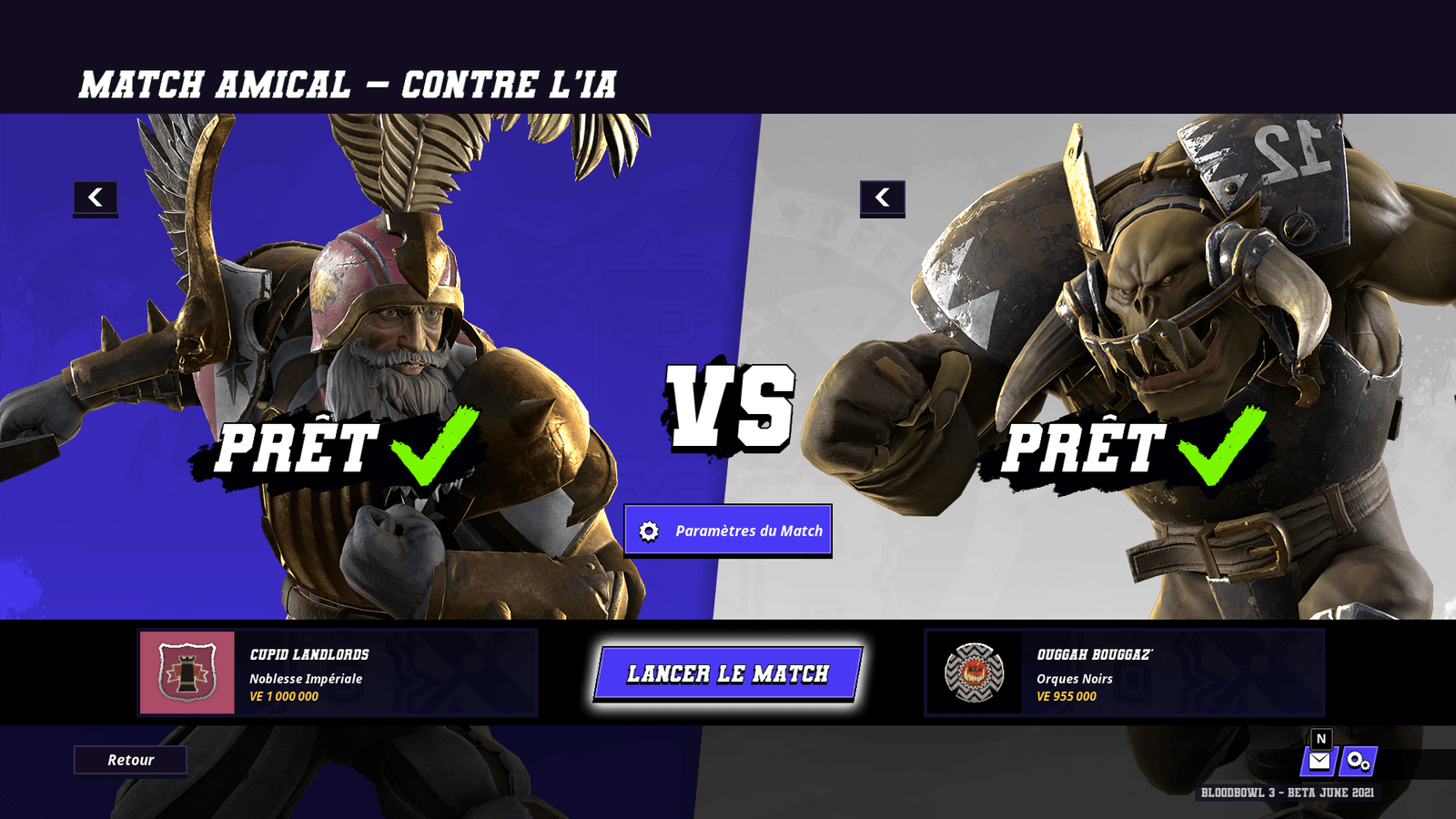 Et les équipes alors ? Il y en a des nouvelles ? Me demandez-vous plein d’espoir à l’idée d’envoyer de nouvelles gueules cassées venger l’honneur futile d’une défaite humiliante. Blood Bowl 3 comprendra 12 équipes au départ – les classiques Orques, les Nains, les Elfes, les Humains, les méchants du Chaos et autres rats mutants – dont deux nouvelles que nous avons pu essayer lors de cette bêta : Les Orques Noirs – en fait ils sont encore plus méchants que les Orcs normaux, mais ils sont aussi verts – et la Noblesse Impériale – en fait ce sont des Humains plus riches que les autres, et vu qu’ils s’ennuient et bien ils font du sport. Deux nouvelles équipes qui ressemblent plus à des variantes des équipes orques et humaines déjà existantes, malgré la présence de capacités qui leur sont propres, et qui accompagnent les graciles Elfes de l’Union elfique pour constituer 3 équipes suffisamment différenciées pour découvrir la bêta du jeu et expérimenter.