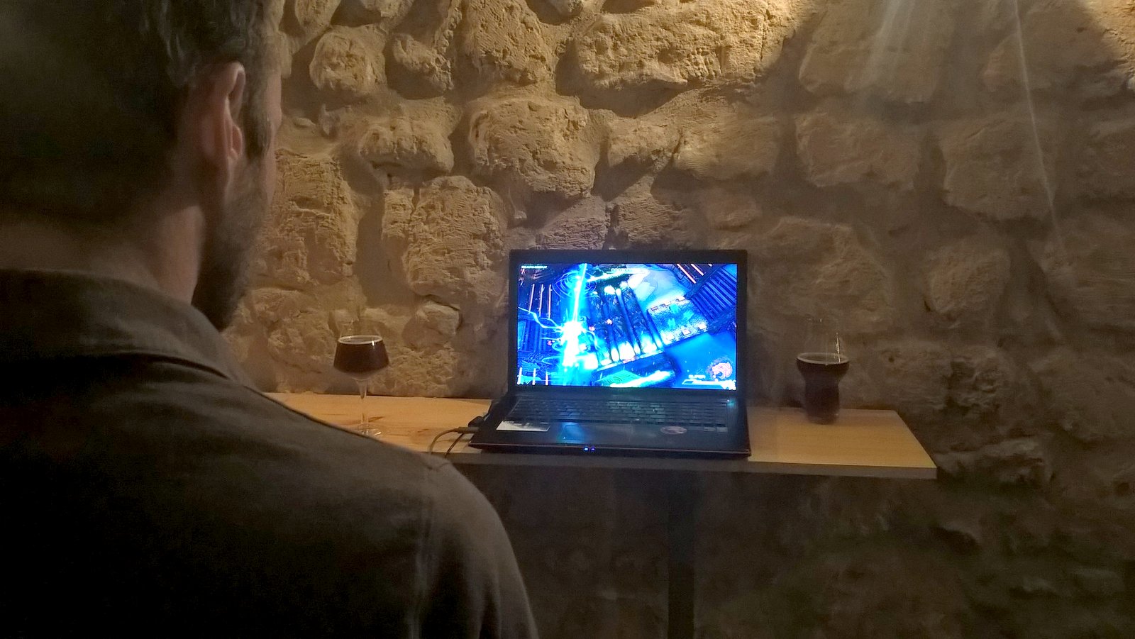 Le rendez-vous est pris au Zythos , un bar à bière tout en pierre apparente qui a le bon goût d’allumer la cheminée un peu avant l’ouverture et de proposer des canapés très confortables. Un cadre idéal pour une belle soirée d’hiver à siroter des bières en mangeant du saucisson. C’est Alex de Manufacture43 qui arrive le premier, chevauchant son skateboard (longboard ? ) affublé d’un sac à dos abritant son PC portable. Adrien du studio Blackflag nous rejoint rapidement et nous nous installons tranquillement dans les canapés tandis que l’équipe de Glitchr arrive elle aussi. S’en suit une discussion sur le jeu vidéo bien entendu mais pas seulement, nous parlons de grattons et du nom qui peut leur être donné dans la région, ainsi que du grand débat pain au chocolat VS chocolatine. Je remercie au passage Océane pour son soutient dans la team « Pain au chocolat ». Après quelques pintes je me retrouve manette en main pour tester les fameuses démos.