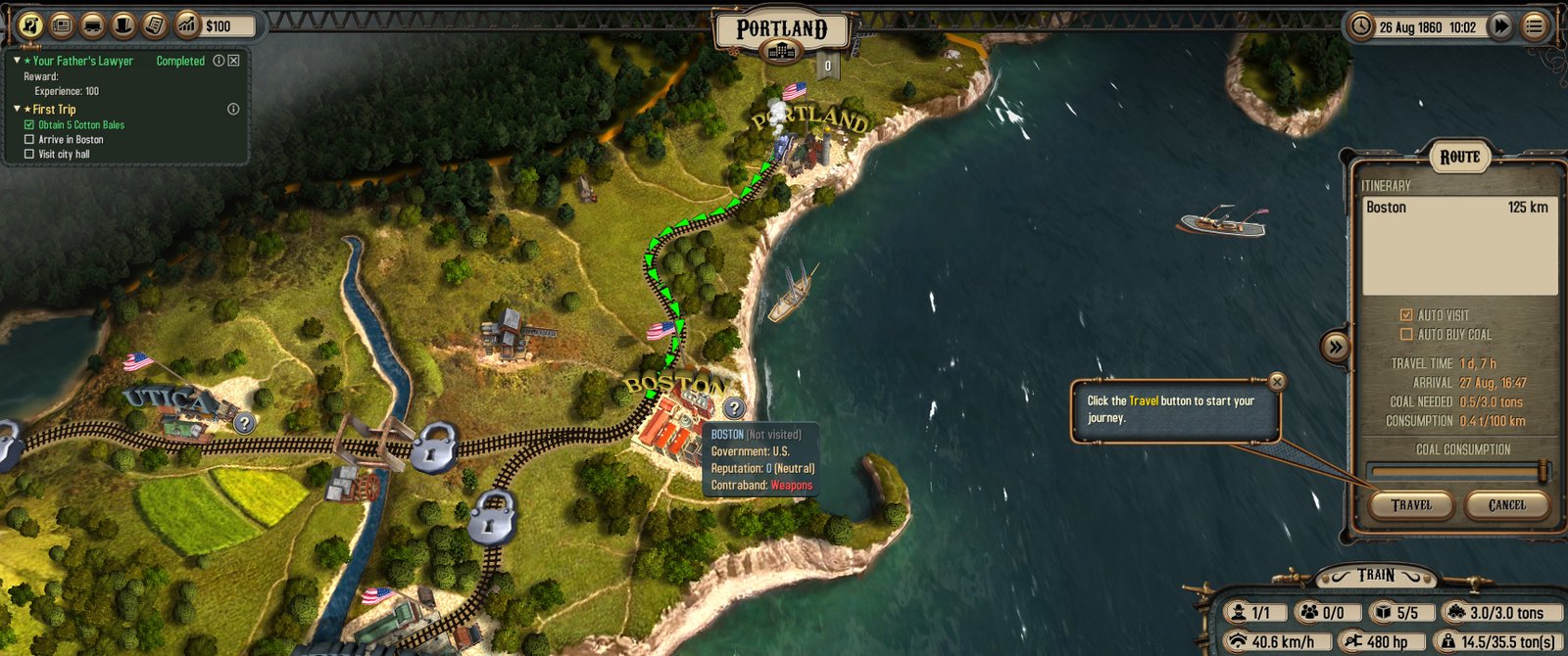 Il faut alors faire attention à plusieurs choses. D’un côté, plus vous attacherez de wagons à une locomotive, plus sa charge sera grande, plus basse sera sa vitesse. Qui plus est, il ne faut pas seulement s’intéresser à la charge totale de nos wagons, mais aussi aux éventuelles cargaisons qui viendront s’y ajouter comme des passagers ou des matières premières. Surcharger-la, et le temps nécessaire pour rallier une ville à l’autre demandera un temps hallucinant. Il en faut en plus de tout cela se soucier de nos réserves de charbon pour alimenter notre machine de métal hurlant, prendre en compte les dégâts causés par l’usure de son utilisation, ou les attaques de bandits et autres.