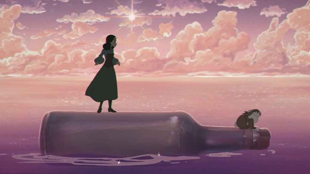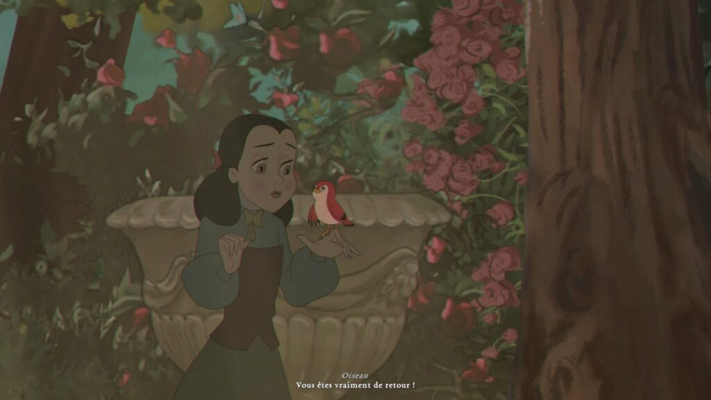 Avant toute autre chose, ce que l’on retient de Sweet Carole, c’est bien entendu sa direction artistique. Entre ses oiseaux qui rappellent Blanche Neige et les Sept Nains, et ses voyages entre deux dimensions qui évoquent inévitablement l’univers de Lewis Caroll (Alice au pays des merveilles) et son lapin à lunettes, le titre rend un véritable hommage aux films d’animation classiques, avec leurs princesses aux attitudes et aux styles vestimentaires caricaturaux. Dessiné à la main comme dans le temps, il ne se cache pas de ses inspirations et rajoute même le petit grain d’antan à l’image. Les cinématiques entre chaque chapitre sont délectables, et le titre joue à fond sur la corde émotionnelle de la nostalgie. Partant de là, on a du mal à voir comment il pourrait aussi appartenir aux jeux d’horreur, comme annoncé. En fait, il y a bien quelques monstres et autres jump scares, mais rien de bien méchant. En tout cas, pas de quoi le classer dans cette catégorie à mon sens.
