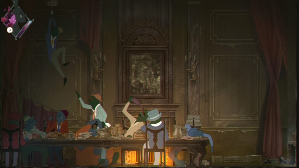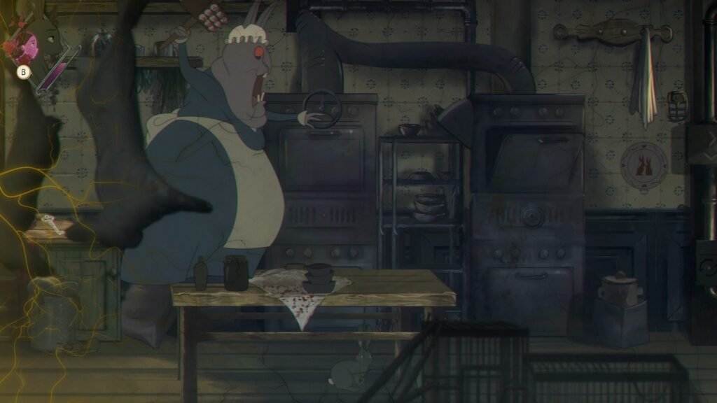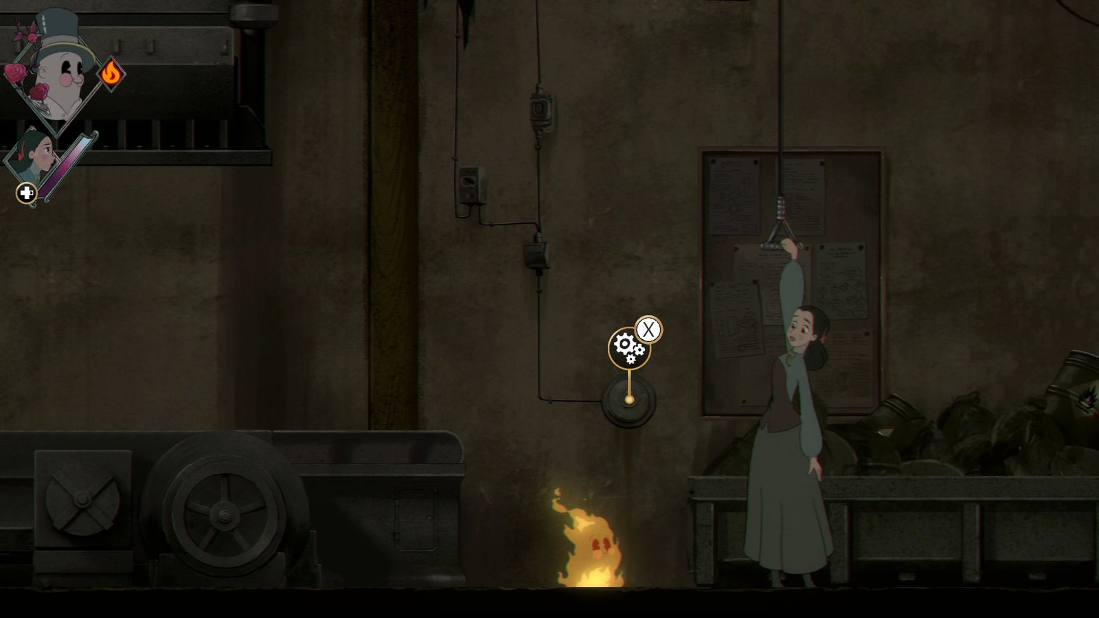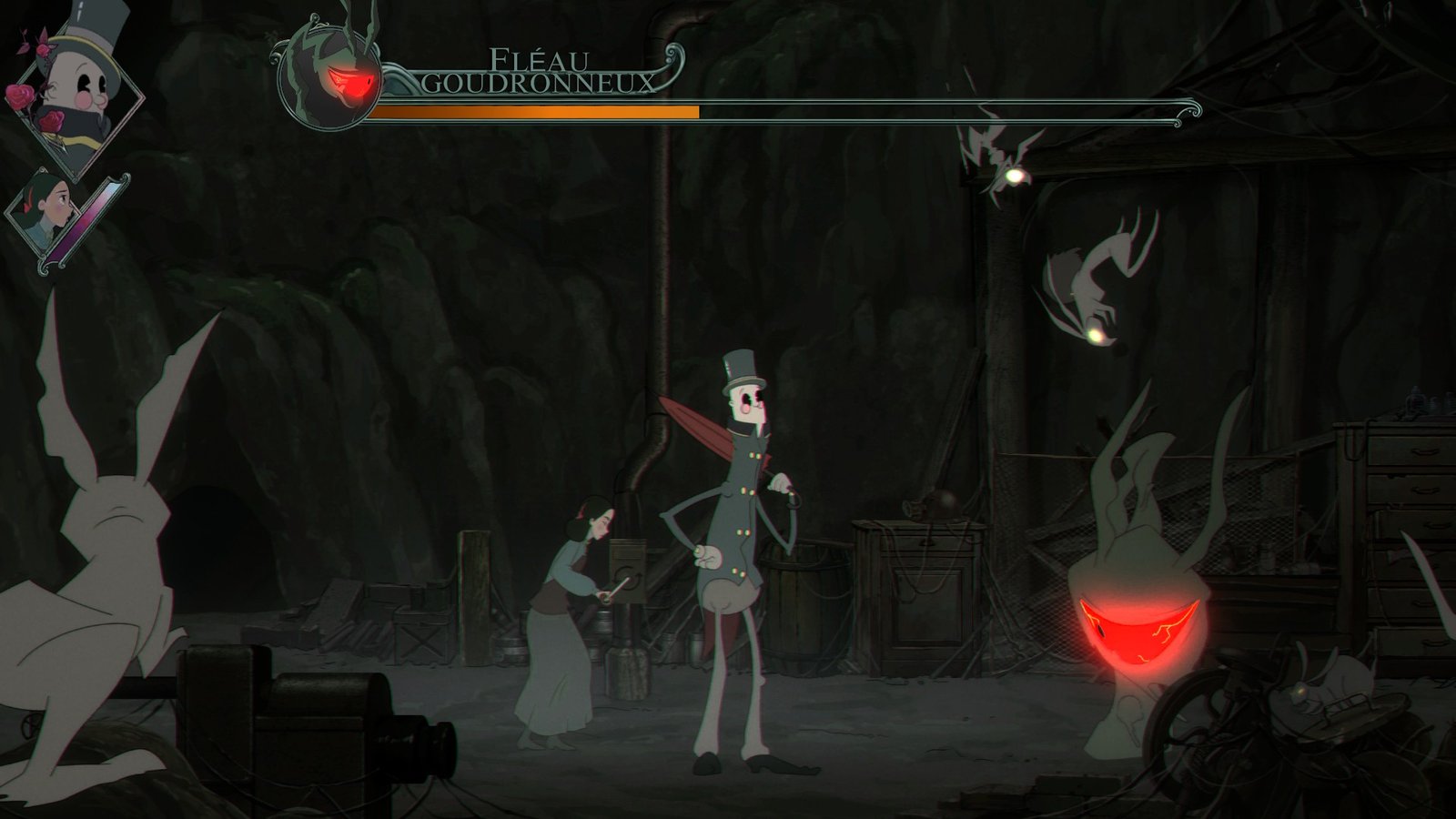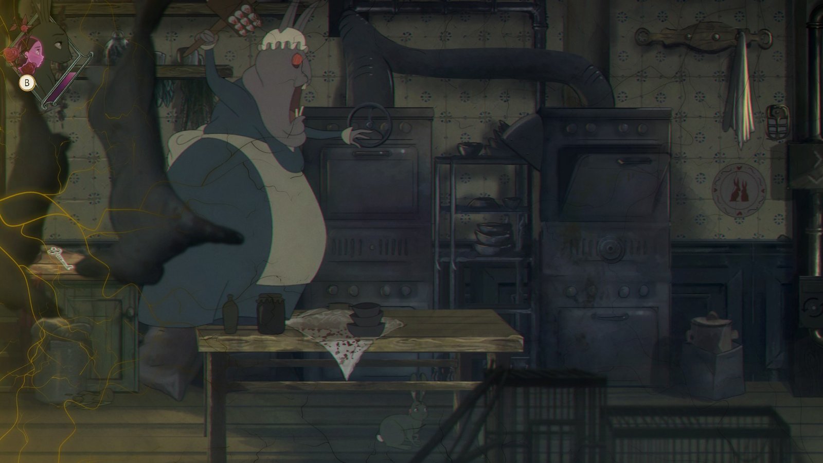 La petite particularité du titre est la possibilité de se transformer en lapine et d’alterner entre les deux formes afin de profiter des avantages de chacune selon les situations. En lapine, on peut courir plus vite et faire de grands sauts ou se glisser dans des passages étroits, voire grimper entre deux parois en rebondissant entre l’une et l’autre. Cependant, on est aussi plus vulnérable, là où on sera plus résistante et plus grande en forme humaine, ce qui est utile pour atteindre certaines poignées en hauteur. C’est aussi le seul moyen de grimper aux échelles ou de traverser les passages nécessitant de garder l’équilibre. À cela se rajoute Baesie que l’on peut parfois contrôler pour se battre avec son parapluie, et dont la tête peut se détacher et s’écraser là où personne ne peut aller. Notre ami peut aussi momentanément s’électrifier ou s’enflammer pour profiter des propriétés de ces deux éléments. Plusieurs allers-retours sont bien souvent nécessaires pour parvenir à nos fins, et il y a même un passage où l’on peut jouer avec le temps et alterner ainsi entre le présent et le futur. À défaut d’être bien mis en application, le gameplayOu « jouabilité » en français, fait référence à la façon dont le joueur interagit avec un jeu vidéo. a au moins le mérite d’être varié.