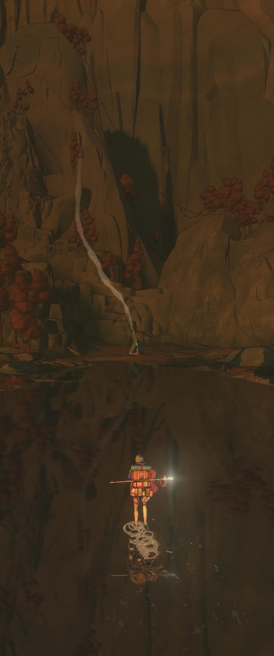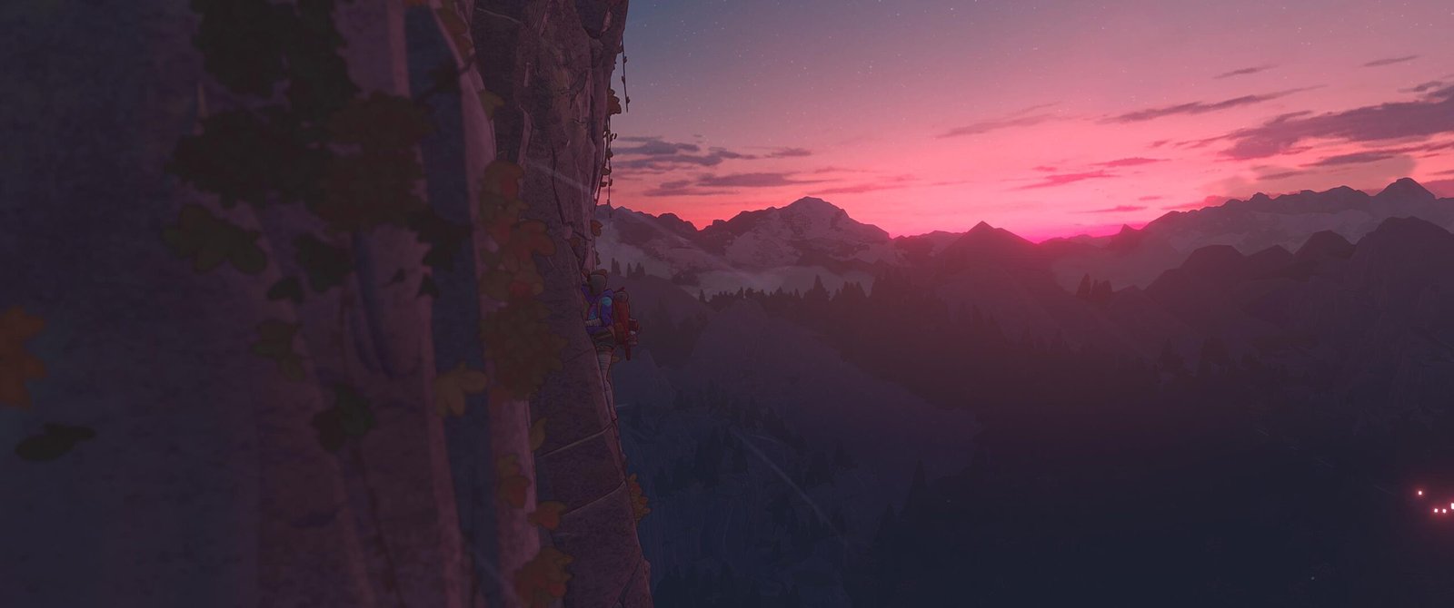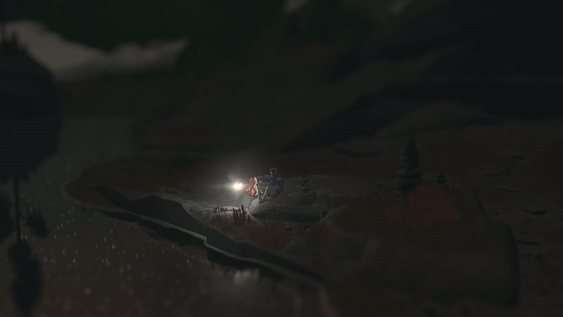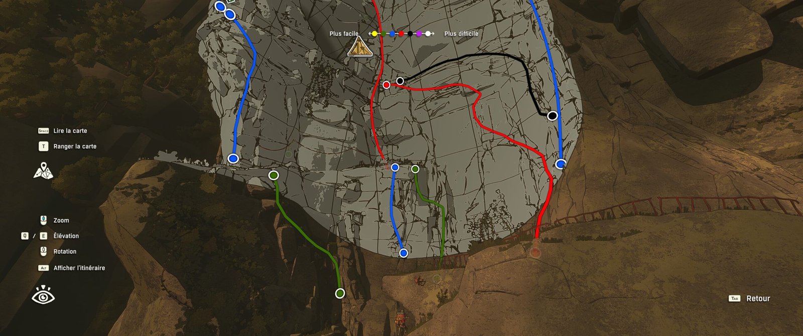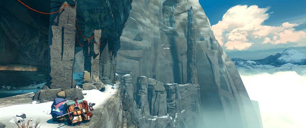 Je parlais de simulateur, mais j’ai surtout vu Cairn comme un puzzle game très ouvert. Chaque falaise qu’on observe laisse place à quelques instants où on va simplement chercher son chemin parmi toutes les possibilités. Il y a vraiment beaucoup de chemins, qui peuvent chacun être classés en 7 catégories de difficulté, mais c’est purement théorique vu que vous pourrez commencer avec quelque chose de simple puis bifurquer sur un chemin plus compliqué d’un coup, sans vraiment vous en apercevoir mais plutôt par la cohérence du flow d’escalade. On trouvera parfois quelques cartes qui nous donneront des indices sur les chemins à prendre, mais il faudra bien fouiller et surtout, ça ne nous aidera que pour quelques segments. Petit à petit, on se retrouve à avoir un vrai instinct d’alpiniste en regardant d’un coup d’œil un pan de mur en se disant « en vrai, là, je passe par là, je pose un piton ici, je prends ce petit café pendant ce segment pour booster ma vitesse et mon endurance, et ça le fait large », alors qu’on n’a absolument jamais mis les mains sur un mur d’escalade et qu’on ne sait même pas faire un nœud de huit.