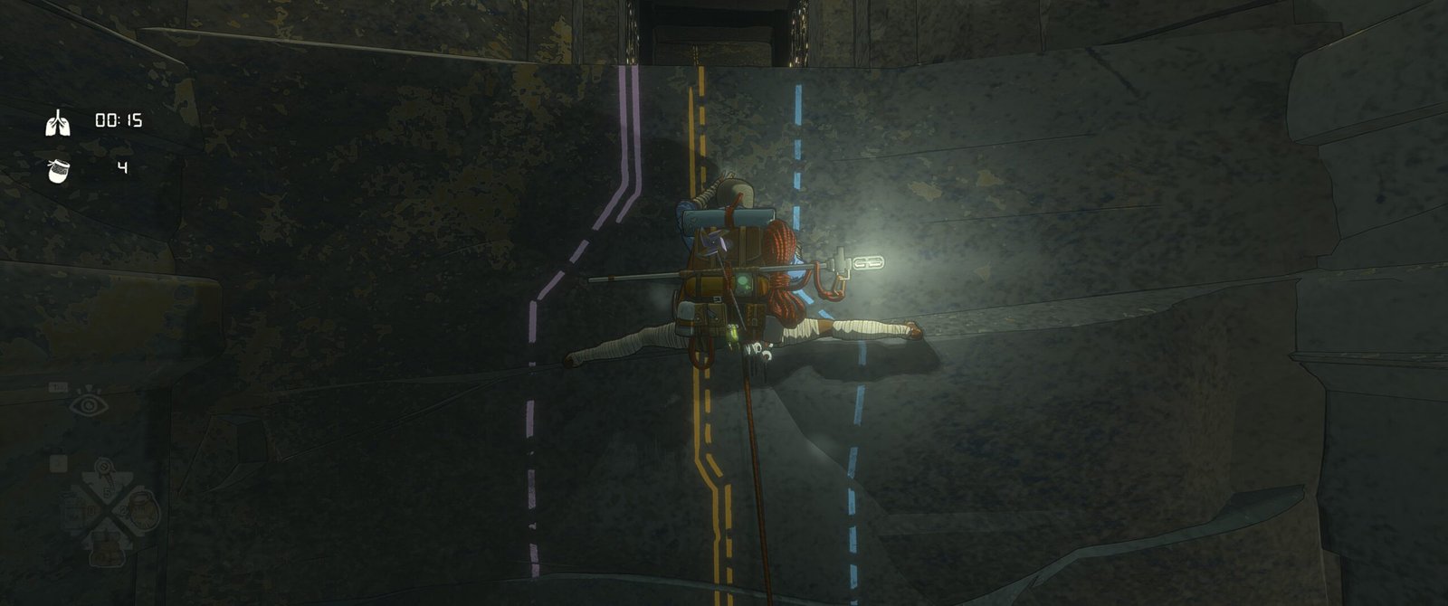 Pour ça, le jeu s’articule autour de ce qui se rapproche le plus d’un simulateur d’escalade. Pour grimper, vous allez devoir contrôler à tour de rôle ses bras et ses jambes pour placer vos mains et vos pieds à des endroits stratégiques sur la falaise. Évidemment, on ira chercher les endroits qu’on peut attraper avec sa main ou poser son pied, mais l’escalade, c’est aussi faire avec des parois parfois lisses. Le jeu, non content de prendre en compte tout un tas de paramètres de survie (endurance, soif, faim, santé, température, adhérence), va aussi calculer la tension des muscles du personnage. Vos pieds et vos mains peuvent glisser et si vous n’avez pas d’accroche possible, il faudra essayer de trouver des appuis qui exerceront une pression sur votre corps pour garder un équilibre (comme si vous poussiez la montagne). Ce ne sont pas des choses physiquement visibles, il faudra faire attention à comment les membres tremblent et si le souffle d’Aava s’accélère (oui, encore de l’intra-diégétique). Lors de certains moments un peu chauds, le jeu vous demandera énormément d’attention et de concentration pour ne pas faire de bêtises, même si, fort heureusement, vous avez des pitons pour vous sauver en cas de boulette (encore faut-il avoir des endroits où la roche n’est pas trop compacte pour en poser).