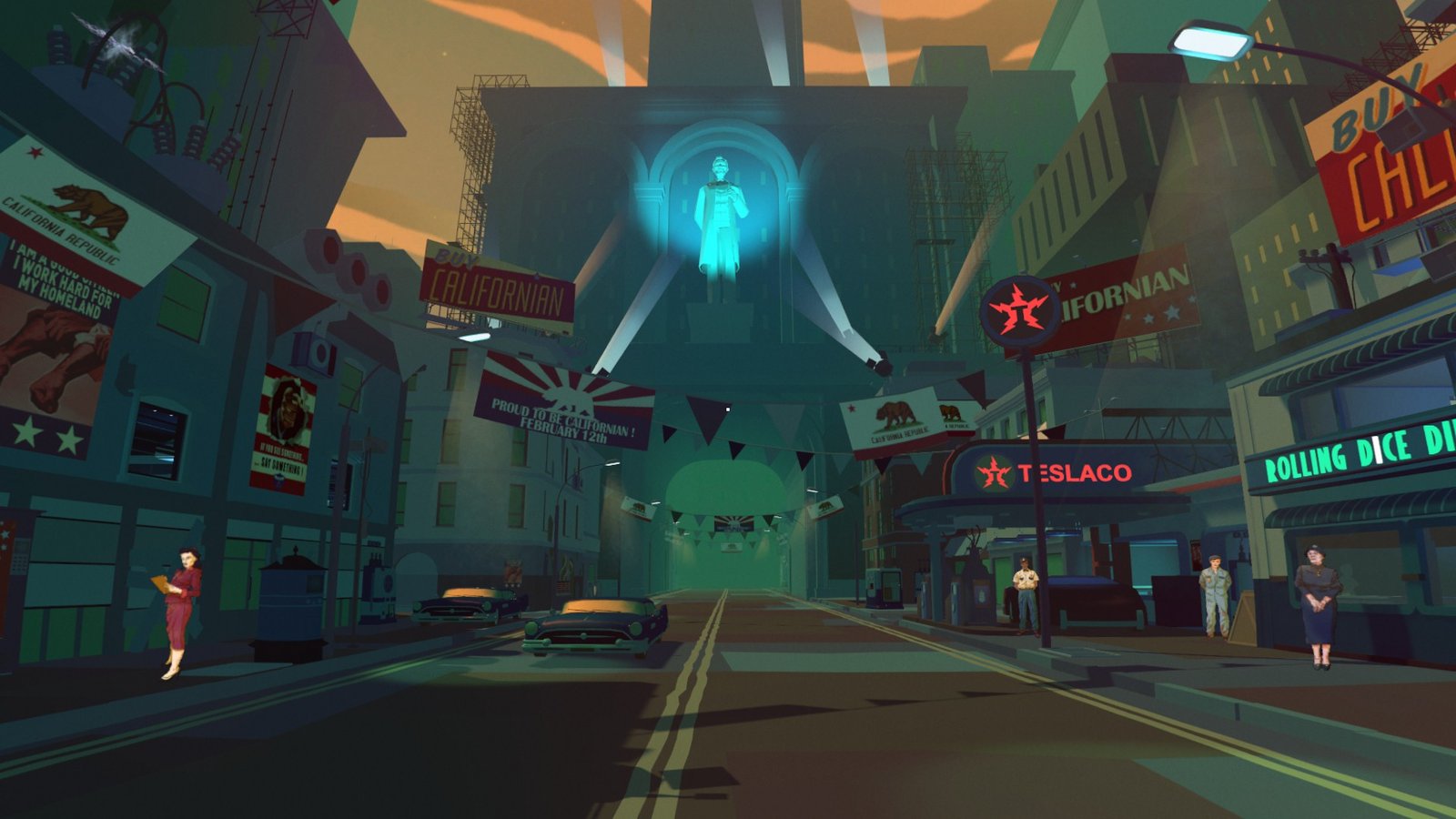 Autour de vous, un univers ensoleillé, une Californie d’antan qu’on aime découvrir. Des personnages stoïques, dessinés à la main et vous suivant du regard, tentent de vous amener un peu de contexte dans ce monde mais vous ressentez que tout est faux, que tout est né de votre imagination. Rapidement, l’étrange vient se mêler à la fête : des petits icônes apparaissent, que vous pouvez cliquer à la souris pour voir le monde se morceler et voir apparaître autre chose, un autre univers, un autre temps, vous n’en savez rien. Enfin, au début du jeu.