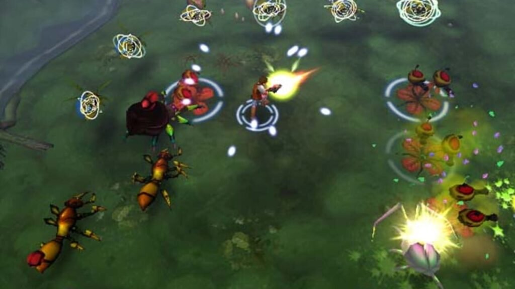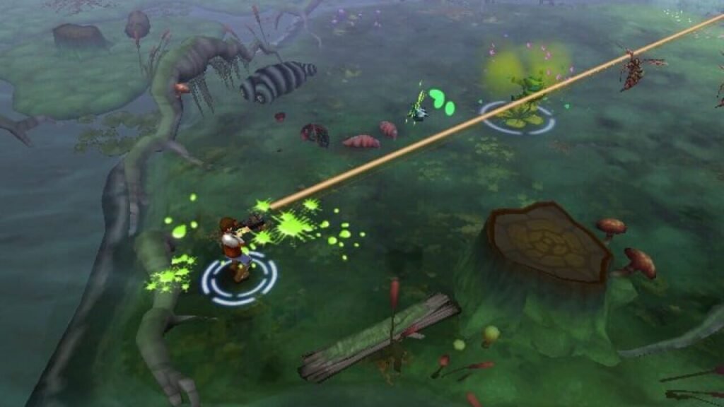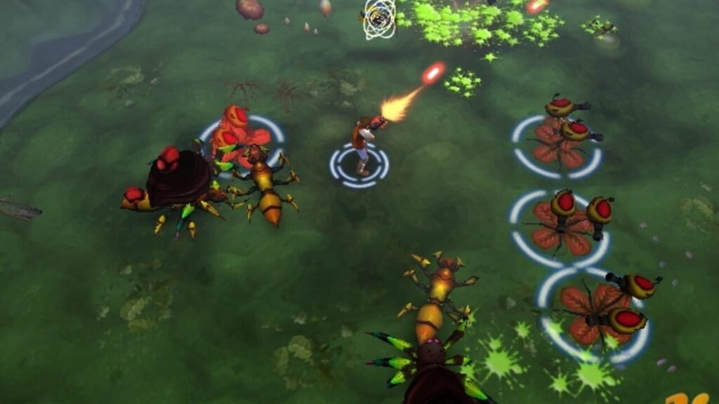 Le jeu se pose en simple ersatz de Geometry Wars et de tous ces shoots à sticks analogiques , à la différence près qu’ici l’un des sticks est sur le nunchuk et l’autre, est votre viseur de wiimote. On tourne alors autour de l’écran pour bien viser des bestioles qui débarquent en vague dans de petites arènes très cloisonnées et sans beaucoup de charme. Une jungle, un desert, des détritus, une ville détruire… On est dans le quelconque, le classicisme à son paroxysme.