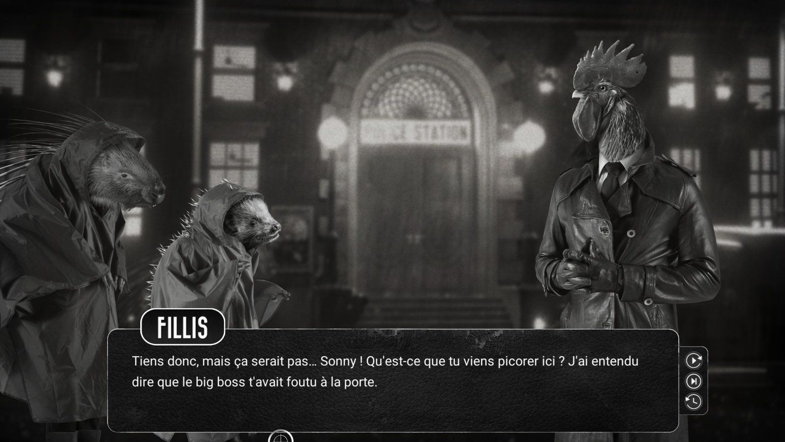 En seulement quelques lignes de dialogue, le titre bulgare réussit à nous happer dans son incroyable univers. Pas avares en bon mots, les deux poulets passent leur temps à se tancer, à s’affubler de sobriquets plus ou moins créatifs et à débattre de leur vision très différente de la vie. Au côté acariâtre de Sonny s’oppose une légèreté bienvenue chez Marty, et on assiste avec plaisir à leurs caquetages remplis de traits d’esprit. Mais Chicken Police ne se résume pas à son unique duo de poulets, il nous introduit aussi une galerie de personnages secondaires hauts en couleur et attachants — la féline Natasha, quelle présence ! — portés par un doublage fabuleux et tout en nuance. La variété des accents qui émane des venelles de Clawville souffle chaudement sur nos esgourdes, et on accueille chaque dialogue comme une nouvelle gourmandise à croquer.