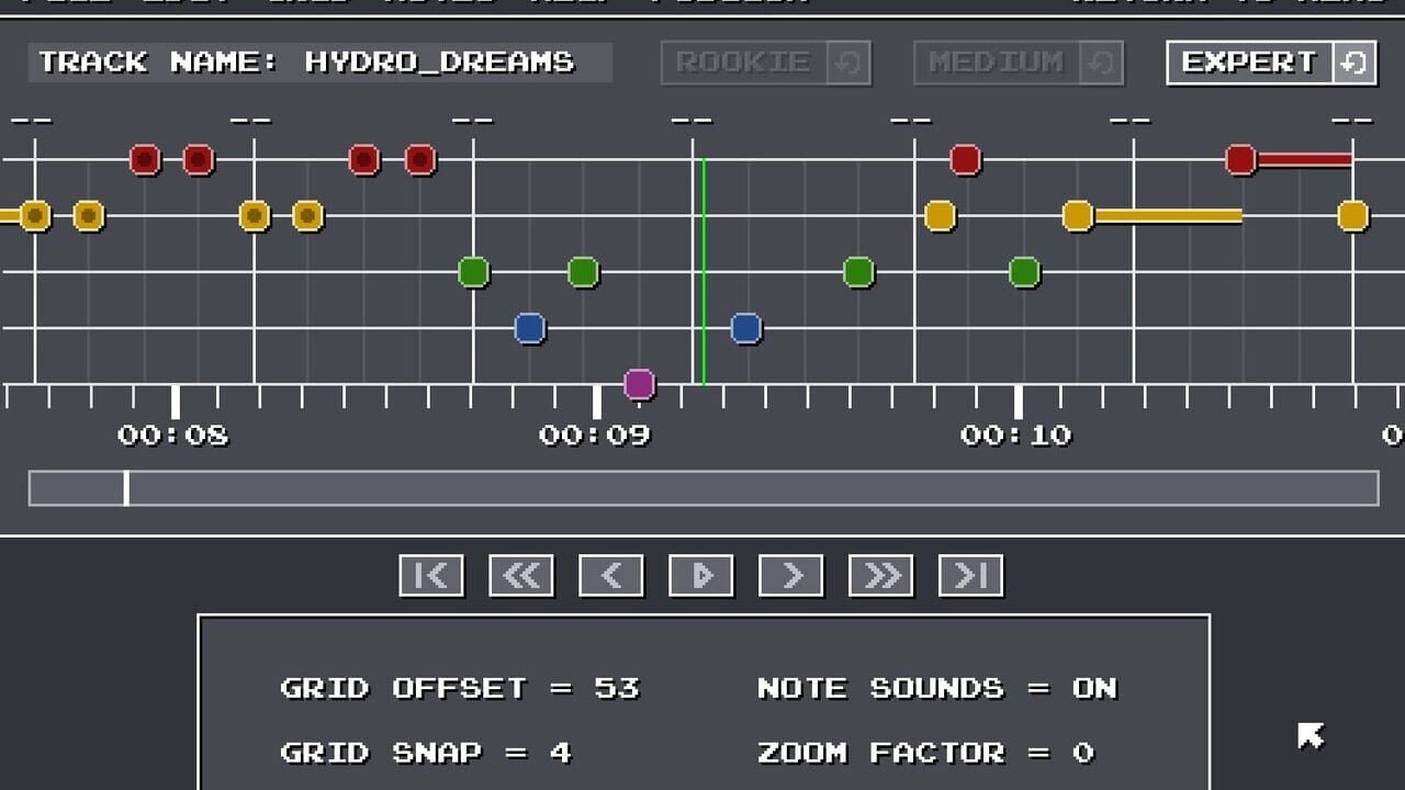 Ajoutez à cela une compatibilité Steam Workshop et l’amateur de musique qui est en vous saura s’y retrouver. Attention : via le Steam Workshop, vous ne téléchargerez que les patterns de notes, libre à vous de reprendre vos musiques en mp3, midi et autres formats via vos différentes offres plus ou moins légales. Une interface bien conçue vous permettra de lier un fichier musical à un fichier de note téléchargé sur le Steam Workshop, pour pouvoir y jouer par la suite. Et évidemment, l’éditeur vous ouvre ses (assez simples) portes pour vous laisser composer vos propres parties. On a vu pire, pour un jeu de rythme à 10 € !