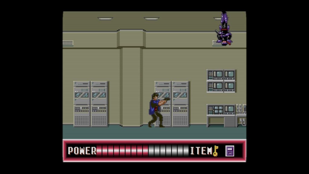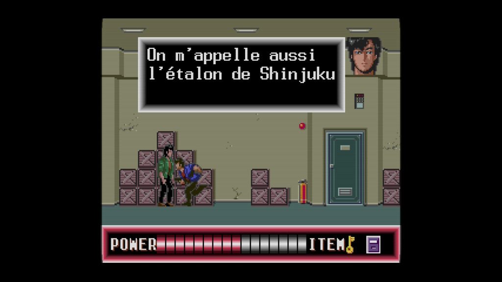 Comme le jeu était intégralement en japonais, évidemment nos braves testeurs uniquement francophones étaient un peu dépités de devoir parcourir les niveaux à l’aveugle, et tester toutes les portes et reparler à tous les PNJPersonnage non-joueur / Personnage non jouable avec lequel on peut interagir. En anglais : NPC - Non Playable Character pour avancer, rallongeant un peu la durée de vie du soft. Maintenant qu’on comprend ce qu’il faut faire avec la traduction, on se rend compte que le jeu est très très court. C’est simple, j’ai parcouru les 4 petits niveaux en à peu près 40 minutes, et, bon, c’est pas nul, mais c’est un gameplayOu « jouabilité » en français, fait référence à la façon dont le joueur interagit avec un jeu vidéo. de 1990, basique. Dans le principe on déplace Ryô/Nicky de droite à gauche dans des décors industriels, où des ennemis apparaissent en bord d’écran et qu’il faut dégommer avec le pistolet. Le long de ces couloirs interminables, des portes, parfois ouvertes, parfois fermées derrières lesquelles se trouvent parfois un PNJ. Il faut alors trouver ces fameux PNJ dans le bon ordre, pour faire avancer la mission, un va refiler une information qui va permettre de parler à un autre qui va donner une clé, qui va ouvrir une porte alors fermée et indiscernable des autres portes, on va parcourir de nouveaux endroits et affronter de nouveaux ennemis, parfois débloquer une arme supplémentaire et finalement arriver à la fin du niveau, où on affrontera parfois un boss. C’est de l’arcade efficace, mais diablement monotone. Les niveaux se ressemblent tous, sauf le dernier, et leur aspect faussement labyrinthique est un peu désorientant. On se borne à faire la même chose, monter et descendre des escaliers, essayer toutes les portes, et faire des allers-retours en esquivant les ennemis ou en les dégommant, le tout sur un fond musical pas mauvais mais j’aurais préféré avoir des versions chiptune des musiques de l’anime plutôt que celles du pourtant habituellement talentueux Naoki Kodaka qui nous sort ici des mélodies pas très inspirées. Le remaster nous gratifie par contre à l’écran titre de la chanson « Get Wild » qui était le générique de fin de la première saison, et si vous basculez sur la version française spéciale, c’est Jean-Paul Césari qui vient pousser la chansonnette, pour lancer les aventures de Nicky, Laura, Mammouth et Gilbert, Gérard, Anatole, Pascaline et je ne sais quels autres prénoms ils ont mis pour remplacer les noms japonais originaux…