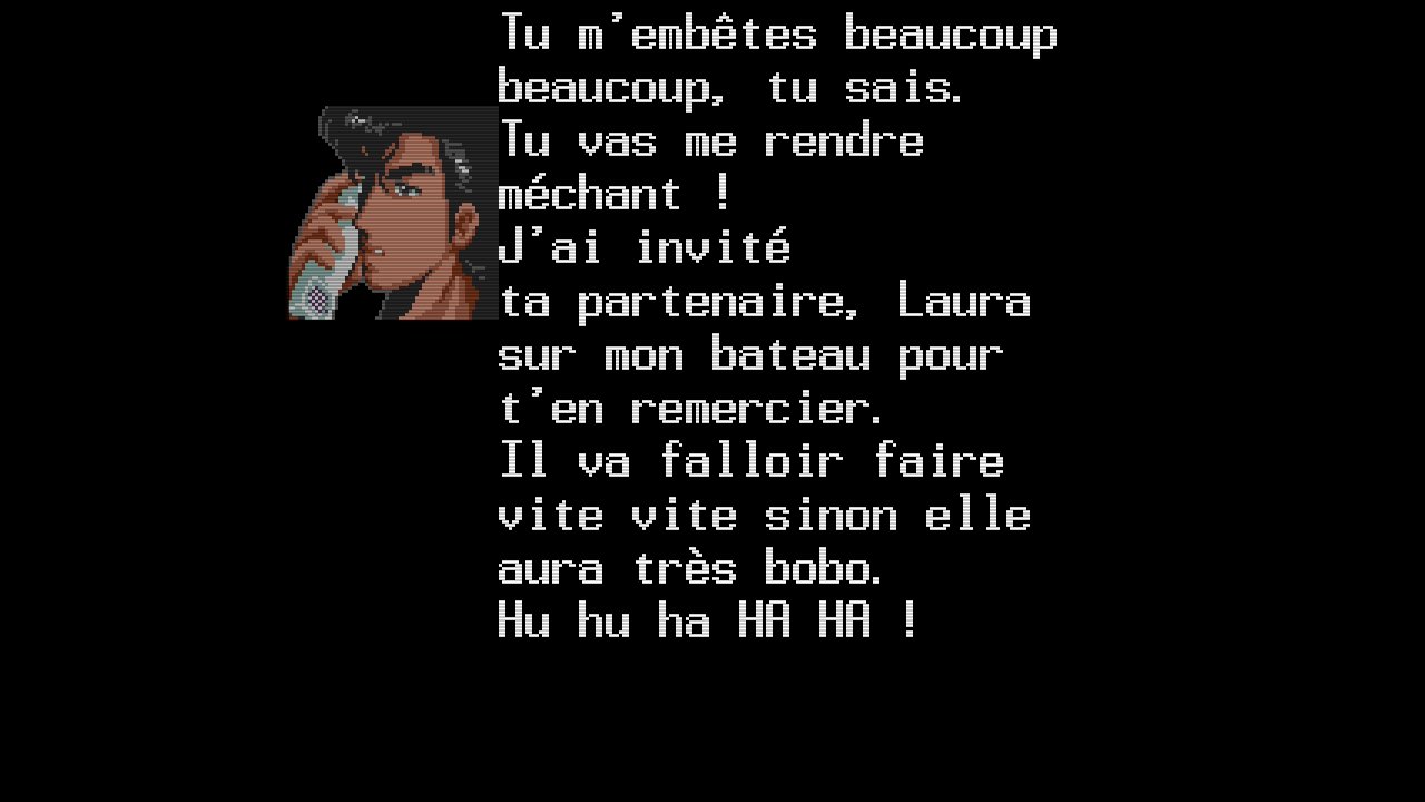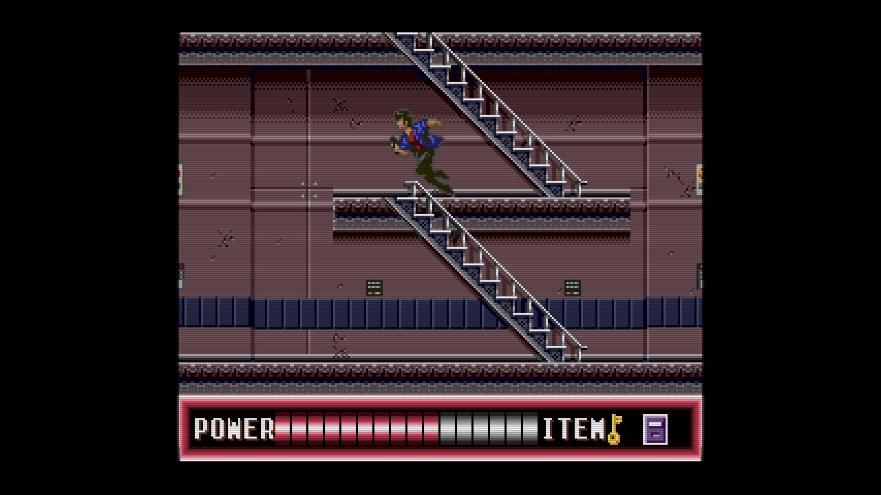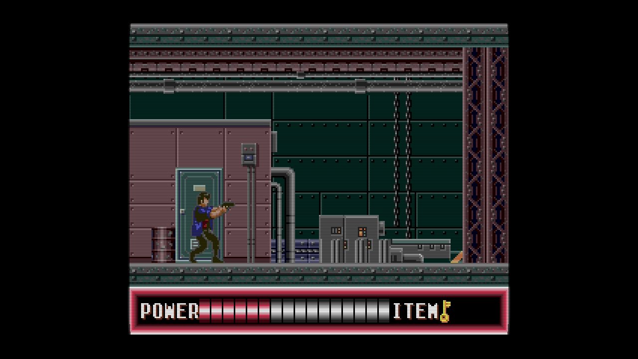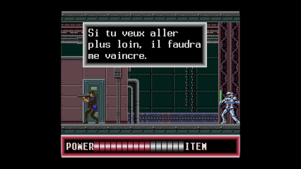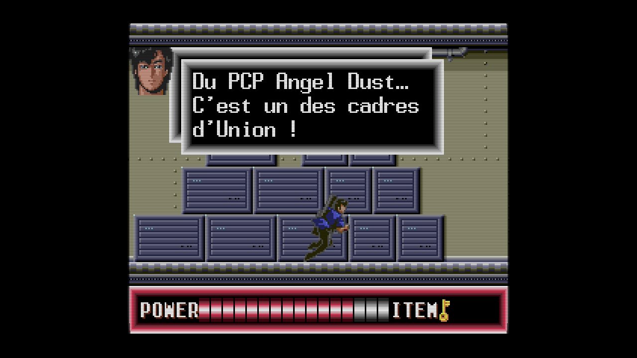 Comme le jeu était intégralement en japonais, évidemment nos braves testeurs uniquement francophones étaient un peu dépités de devoir parcourir les niveaux à l’aveugle, et tester toutes les portes et reparler à tous les PNJPersonnage non-joueur / Personnage non jouable avec lequel on peut interagir. En anglais : NPC - Non Playable Character pour avancer, rallongeant un peu la durée de vie du soft. Maintenant qu’on comprend ce qu’il faut faire avec la traduction, on se rend compte que le jeu est très très court. C’est simple, j’ai parcouru les 4 petits niveaux en à peu près 40 minutes, et, bon, c’est pas nul, mais c’est un gameplayOu « jouabilité » en français, fait référence à la façon dont le joueur interagit avec un jeu vidéo. de 1990, basique. Dans le principe on déplace Ryô/Nicky de droite à gauche dans des décors industriels, où des ennemis apparaissent en bord d’écran et qu’il faut dégommer avec le pistolet. Le long de ces couloirs interminables, des portes, parfois ouvertes, parfois fermées derrières lesquelles se trouvent parfois un PNJ. Il faut alors trouver ces fameux PNJ dans le bon ordre, pour faire avancer la mission, un va refiler une information qui va permettre de parler à un autre qui va donner une clé, qui va ouvrir une porte alors fermée et indiscernable des autres portes, on va parcourir de nouveaux endroits et affronter de nouveaux ennemis, parfois débloquer une arme supplémentaire et finalement arriver à la fin du niveau, où on affrontera parfois un boss. C’est de l’arcade efficace, mais diablement monotone. Les niveaux se ressemblent tous, sauf le dernier, et leur aspect faussement labyrinthique est un peu désorientant. On se borne à faire la même chose, monter et descendre des escaliers, essayer toutes les portes, et faire des allers-retours en esquivant les ennemis ou en les dégommant, le tout sur un fond musical pas mauvais mais j’aurais préféré avoir des versions chiptune des musiques de l’anime plutôt que celles du pourtant habituellement talentueux Naoki Kodaka qui nous sort ici des mélodies pas très inspirées. Le remaster nous gratifie par contre à l’écran titre de la chanson « Get Wild » qui était le générique de fin de la première saison, et si vous basculez sur la version française spéciale, c’est Jean-Paul Césari qui vient pousser la chansonnette, pour lancer les aventures de Nicky, Laura, Mammouth et Gilbert, Gérard, Anatole, Pascaline et je ne sais quels autres prénoms ils ont mis pour remplacer les noms japonais originaux…