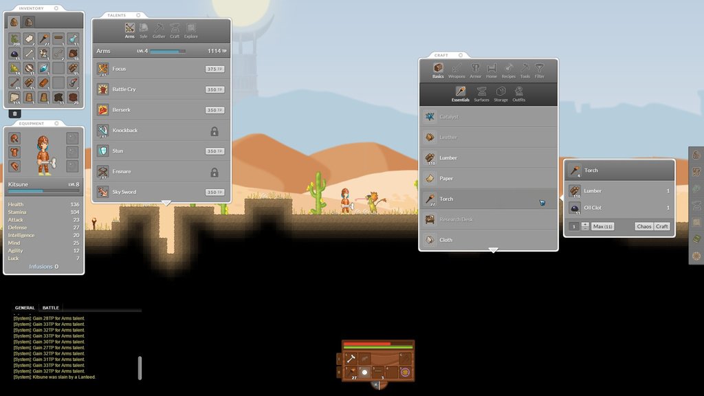 Il y a 5 talents différents comportant chacun entre 12 et 19 compétences actives ou passives : • Arms : Des compétences liées au combat avec des armes (sword proficiency, knockback, dash…). • Craft : Tout ce qui concerne le craft avec notamment des sorts pour influer sur la qualité et le chaos (polish, refine…). • Explore : Des atouts qui faciliteront votre exploration (double jump, flare, ledge grab…). • Gather : Pour une collecte moins laborieuse des ressources (tool proficiency, pickup reach boost, tool speed boost…). • Style : Une catégorie qui concentre ce qui tient de la magie (heal, invisible, wand proficiency).