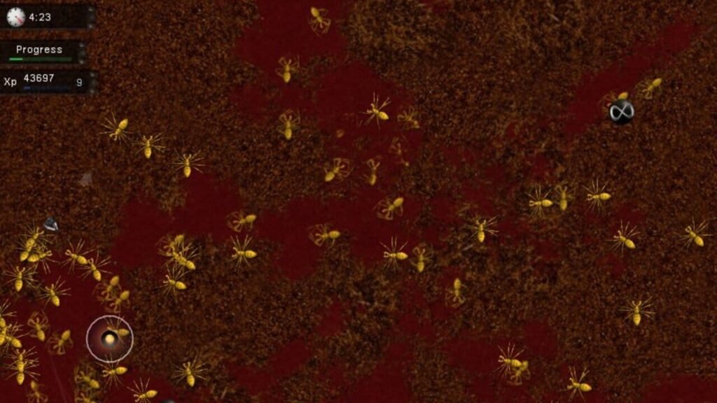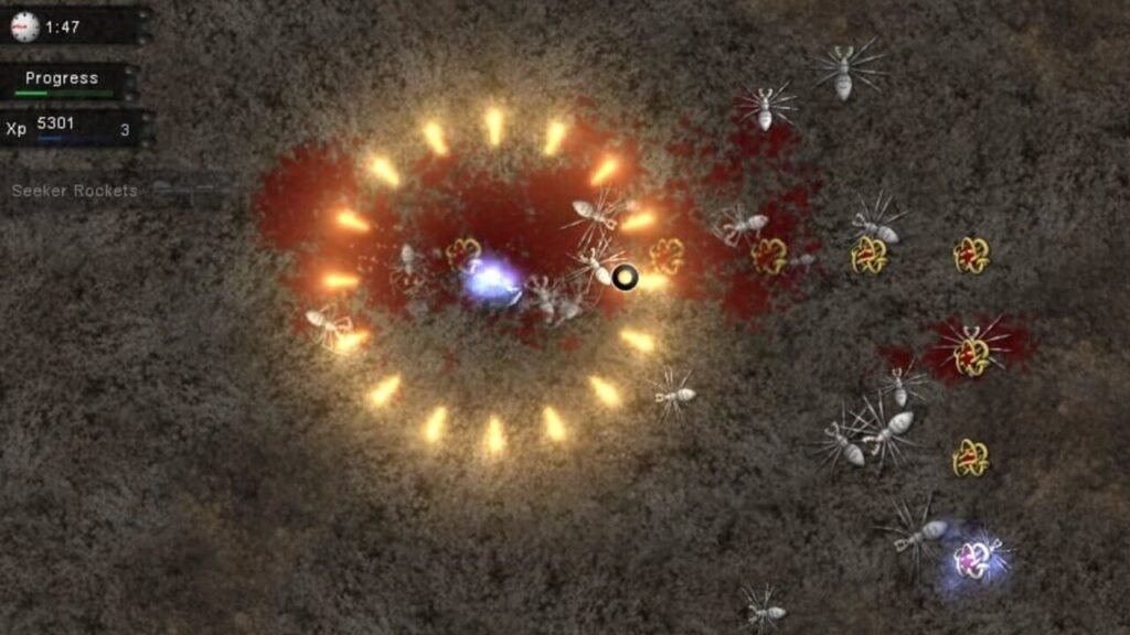 Le premier stick pour se déplacer, le second pour viser, une touche pour tirer et une dernière pour recharger ( combo clavier / souris également possible ), pas de doute, nous sommes dans un jeu d’arcade pur et dur. L’histoire est totalement anecdotique, vous devrez traverser 60 niveaux remplis d’aliens, lézards, zombies, araignées géantes et autres créatures bien repoussantes . Si le décor change peu ( pas d’obstacles, uniquement six couleurs pour changer quelque peu le rendu ), les développeurs ont fait un effort pour donner un thème à chacun d’entre eux en variant les situations. Vous serez quelque fois encerclé par les ennemis, vous devrez affronter plusieurs vagues successives, éliminer les nids qui apparaissent partout avant de vous faire submerger, survivre avec une arme précise, etc.