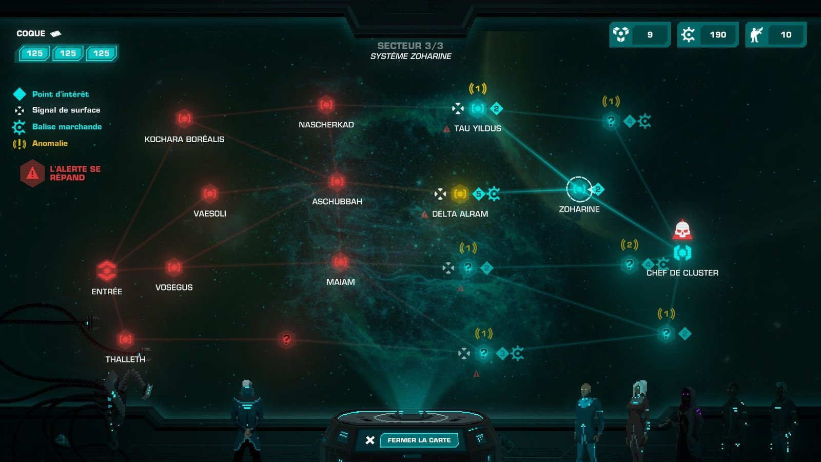 Tout comme son ainé, vous irez de secteur en secteur, en choisissant votre route avec la possibilité de connaitre les types d’événements qui vous attendent. Et c’est là où se démarque le jeu. Sur chacun des systèmes solaires que vous visiterez, plusieurs événements interviendront. Dans un premier temps, vous serez toujours face à un cube de Néo-N afin de récupérer un peu de carburant ( la récupération dépendra des améliorations que vous aurez débloquées ) puis sur chacune des planètes, vous aurez soit un événement narratif aléatoire ( pouvant donner une quête à résoudre sur une autre planète d’un autre secteur ), soit une exploration d’une planète où vous enverrez l’un de vos officiers accompagné d’un commando pour récupérer la ferraille ( la monnaie du jeu, servant aussi bien à faire ses emplettes qu’améliorer son vaisseau ) mais aussi des armes/escadrons/nouveaux officiers.