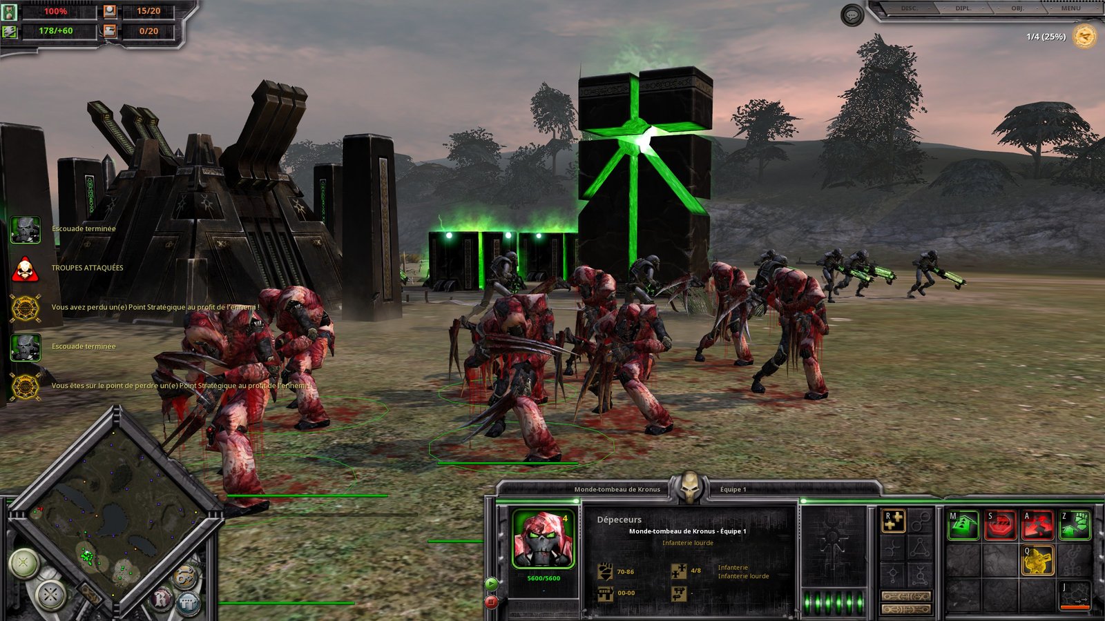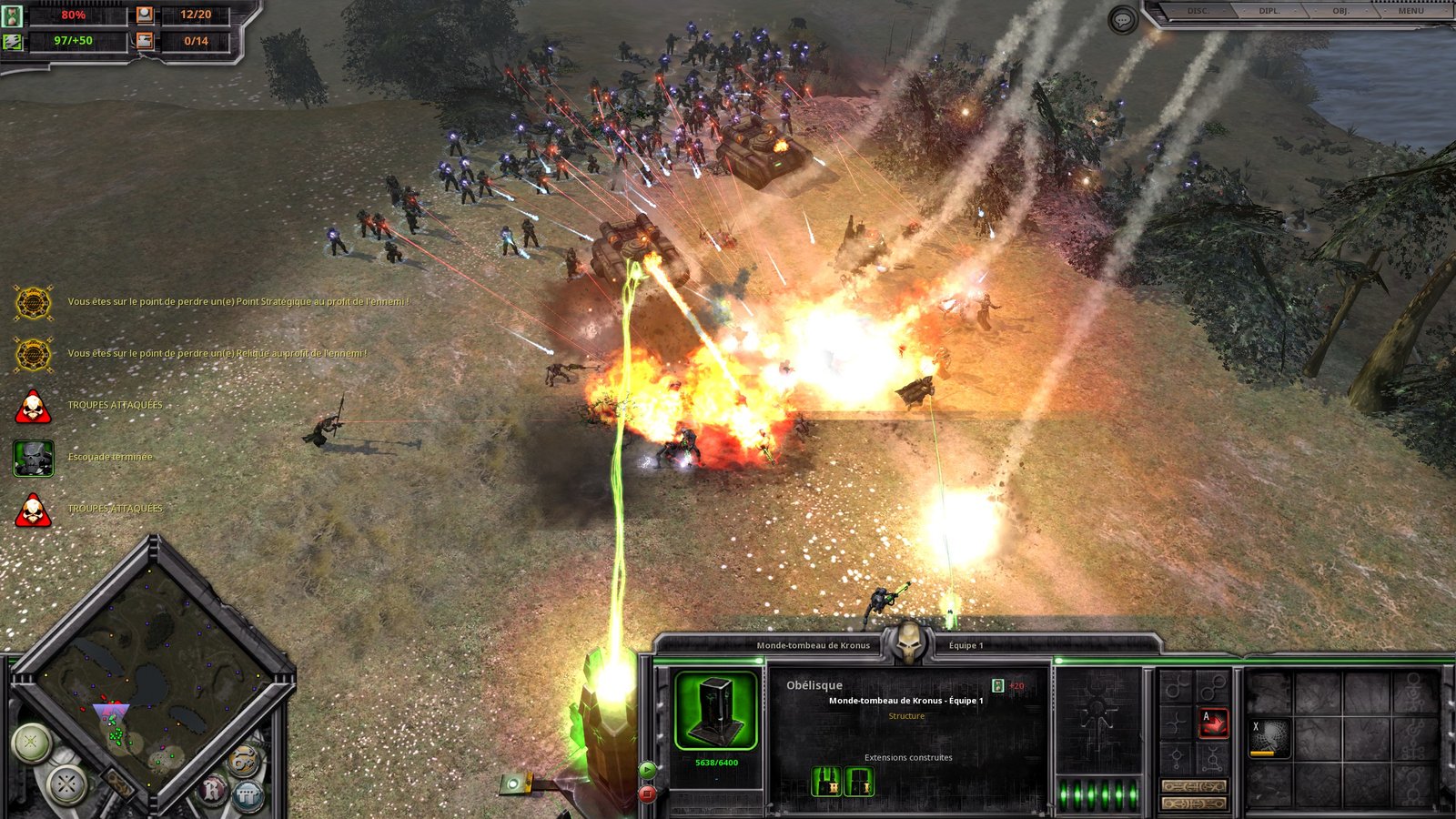 Sur la première annonce de cette version, j’avoue avoir eu un peu trop d’enthousiasme (la nostalgie, le fléau des pensées rationnelles). Alors que je m’attendais à une large modernisation du jeu, je suis un peu déçu dès les premières secondes qui suivent le moment où je presse le bouton « jouer ». Déjà, il y a cette intro mythique, odieusement upscalée et mise à 60 FPS par IA, ce qui rend la vidéo toute blurry et enlève beaucoup d’impact (un comble). Puis, on arrive sur le menu principal et là, les souvenirs m’envahissent, avec la musique et ce bon vieux Gabriel Angelos, fier et au crâne anguleux, en gros plan. C’était très beau pour un STR en 2004, mais aujourd’hui, ce modèle 3D en très gros est bien plus repoussant. C’est le genre de décision d’époque qui a mal vieilli. Puis les sensations reviennent, avec un menu quasi identique, chaque chose est bien rangée, comme si on revenait dans la chambre inhabitée d’un mort, plusieurs années après son décès. Ne restera que le menu Campagne, qui contient maintenant un sous-menu vers les différentes extensions (et un chargement sera nécessaire après chaque sélection). Dans les faits, cette definitive edition n’est rien de plus qu’une réunification de tout ce qui est sorti en un seul jeu, dans la version la plus brute possible.