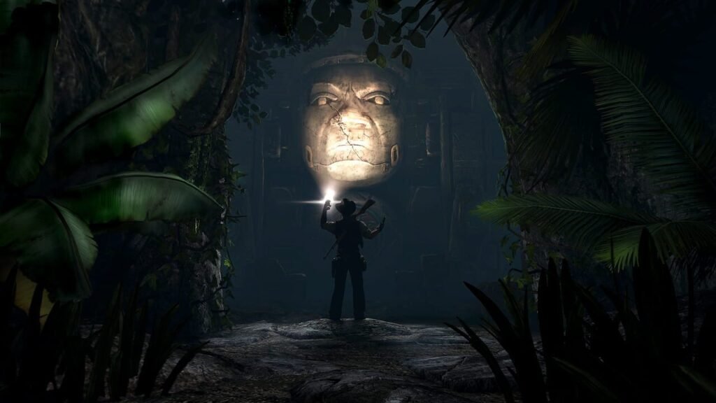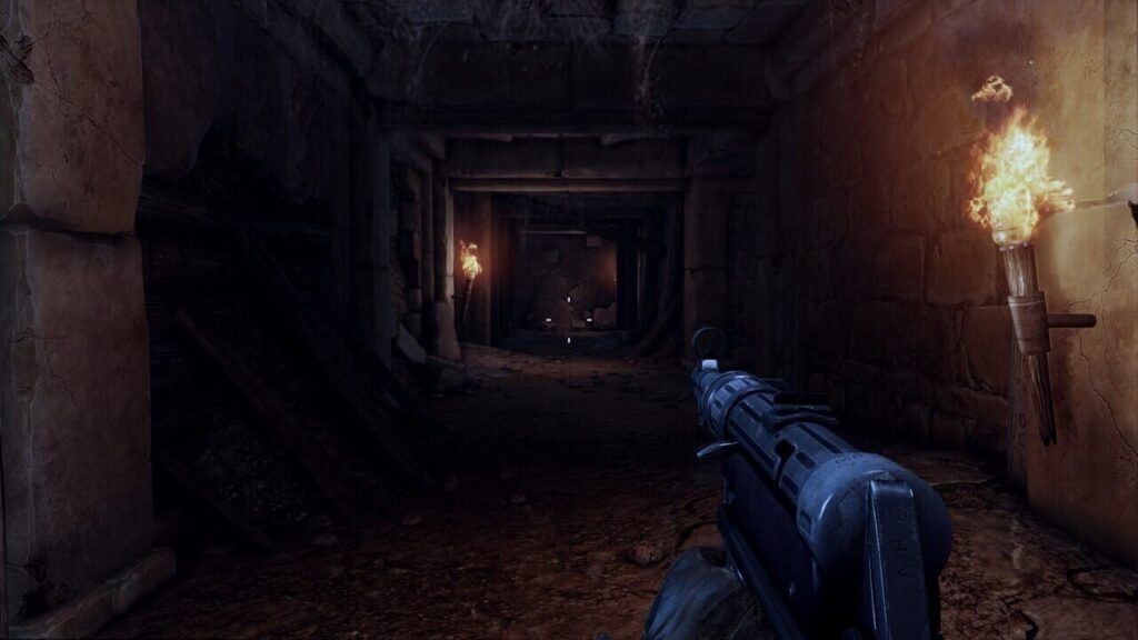 Inspiré des romans mettant en scène le célèbre aventurier Allan Quatermain en nous proposant de suivre son fils complètement à l’opposé, beaucoup plus immoral et peu humain, D eadfall Adventures commence déjà avec un gros cliché : celui de l’antihéros. Il fera équipe avec une jeune Anglaise farouche (bah tiens) contre des nazis pilleurs de tombe (sérieusement ?) qui tentent de récupérer un incroyable trésor ancestral pour donner au Furher de quoi dominer le monde. D’accord, c’est complètement cliché, mais attendez-vous au pire. Trois destinations vont vous être proposées : du sable d’Égypte, la neige de l’Arctique et les temples Mayas. Mais dès les premières notes de musique sur le menu principal, on reconnaît quelle est la référence principale des développeurs de chez Farm 51 : Uncharted. On pourra dire tout ce que l’on veut de cette trilogie crée par Naughty Dog, il y a quelque chose qu’elle fait magnifiquement bien : elle propose une atmosphère, un style, un univers très particuliers reconnaissables entre pleins. Deadfall Adventures se contente de tout lui voler, de la musique au héros, des situations aux trésors à déceler, de la sidekick féminine téméraire au vieux mentor. Sauf qu’il reprend tout cela dans un FPS bas de gamme… Le jeu se compose de deux styles. Du bourrin, pour commencer, où vous tirerez sur des Allemands venus vous gêner dans votre course au trésor ancien, mais où il s’agira aussi d’illuminer des momies avec votre lampe torche pour les affaiblir et vous en débarrasser. En parallèle, vous aurez des moments d’énigmes vous proposant de sortir un bloc-notes qu’on pourrait qualifier de magique et qui, en toute circonstance, possède une petite indication pour vous dire ce que vous devez faire. Vous cliquerez sur des stèles, échapperez à des pièges, bougerez quelques miroirs, tirerez sur des plaques dorées, tout cela pour enclencher des mécanismes souvent très simples et peu logiques qui font office de moment de réflexion souvent plus frustrant. La recette est bonne, le problème est davantage dans sa conception.