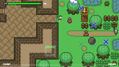 Ainsi, la concentration est telle que l’on ne voit pas ce qu’il se passe à l’écran. Je me rappelle être passé de « j’ai récupéré une épée en bois ( dans un niveau très typé Zelda ) » à « faire un kaméhaméha vert à une pieuvre géante ! » L’unique moment dans le jeu où l’on peut respirer, ce sont les phases de dialogues, frustrantes car on ne les contrôles pas. Ce manque de contrôle se justifie par le fait que l’on soit sur une piste musicale. En mode aventure ( donc aucune recherche de scoring ), il serait peut-être judicieux de donner la main au joueur pour passer les dialogues, en ajoutant par exemple une boucle. Ceci lui permettrait de respirer ( même si ce n’est qu’une petite seconde de plus vis-à-vis du système actuel ). Enfin, aujourd’hui, la réussite de l’appui en rythme n’a qu’une influence sur la barre de vie de notre héros et non sur l’aventure qu’il vit. Et ça, c’est bien dommage…