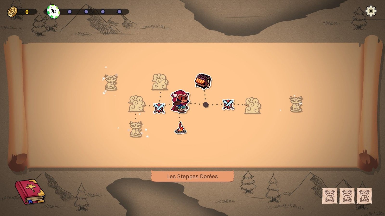 Vous démarrez sur un point d’une carte, avec la visibilité sur les événements qui vous entourent, événements qu’il faudra résoudre pour voir la suite du chemin. Les événements seront de trois types : combats, marchands et obtention d’objets (de soin ou équipements pour vos chimères). Évidemment, le cœur du jeu sera le combat. Si l’on débute avec trois chimères très basiques, vous aurez la possibilité d’en recruter dans chacun des biomes que vous allez traverser avec un système très intéressant. Sur la carte, dans chaque zone, vous aurez trois statues à découvrir, où chacune d’entre elle permettra de découvrir une chimère à recruter, sachant que vous ne pouvez recruter qu’une chimère (via ce système) par biome. Dans l’idéal, le mieux est de découvrir les trois statues pour pouvoir choisir la chimère qui correspond le mieux au build que vous êtes en train de construire. Mais faire ceci fait perdre des potentiels bonus, car une fois une chimère choisie, les autres autels non visités se transformeront en coffre, donnant or et nourriture pour soigner/booster vos chimères. Il vous faudra donc peser dans la balance le fait de se payer le luxe de choisir une chimère ou préférer des bonus si la première voire la seconde chimère nous satisfait.