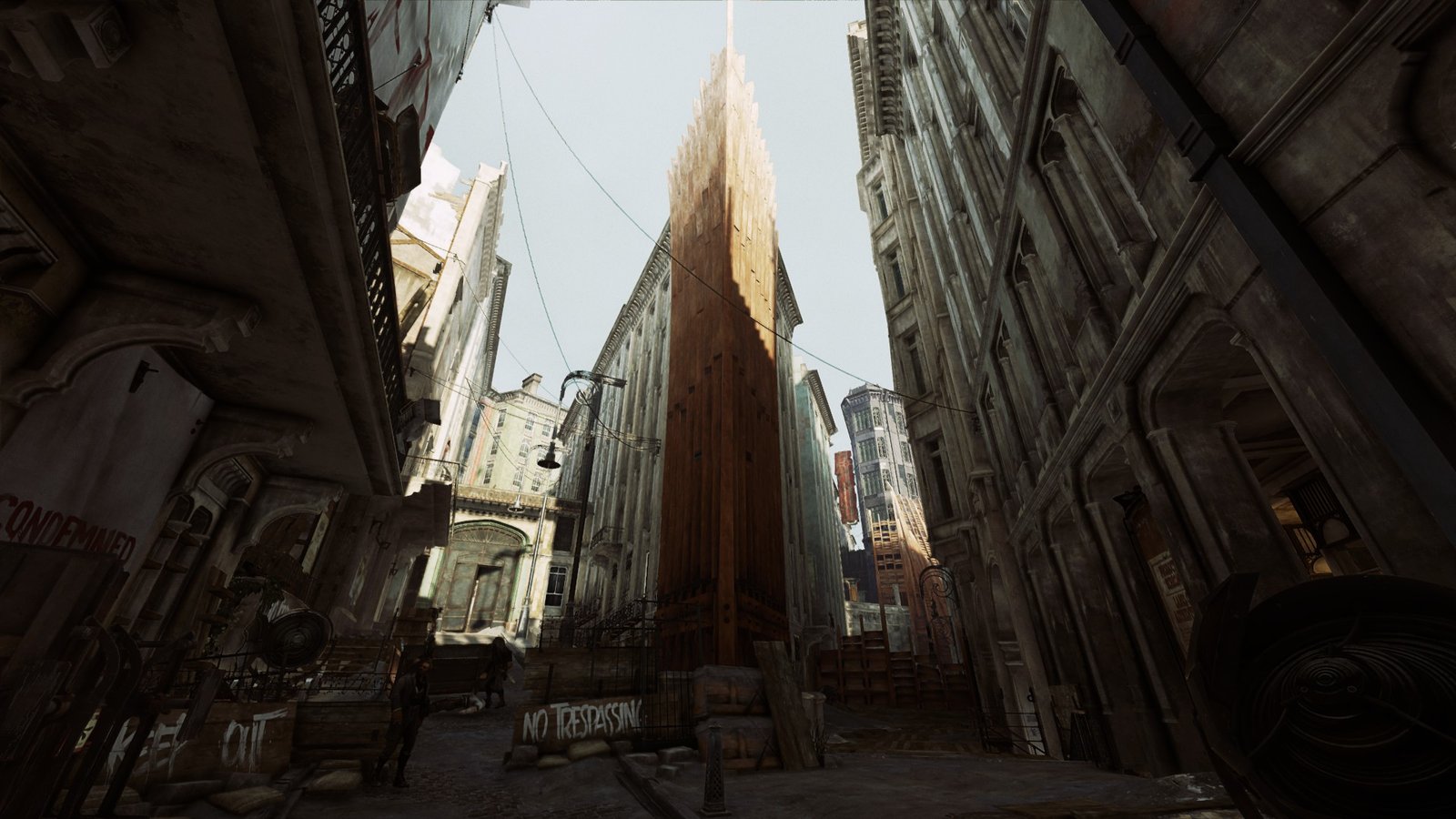 Peut-être moins sophistiqués et impressionnants que leurs compères de pierres, les habitants de Serkonos affichent toujours ces mines au style ciselé, comme s’ils avaient été taillés avec un couteau. Leur visage est marqué par des rides de caractère, les pommettes creusées pour certains. Cela ne les empêchent pas de donner vie à Karnaca en la peuplant de leur individualité. Les niveaux sont plus grands et plus ouverts qu’auparavant. Ils s’imbriquent dans une logique de quartier en évitant de trop nous faire sentir leurs murs invisibles qui en définissent pourtant les limites. Il y a aussi beaucoup de verticalité s’entremêlant dans tout autant d’horizontalité. Les chemins qui s’y présentent ne paraissent pas autant forcés et linéaires que dans le premier Dishonored, où la construction des niveaux était moins naturelle. On a ici beaucoup plus l’impression d’évoluer dans une vraie ville autant que son level design nous permettra de le croire.
