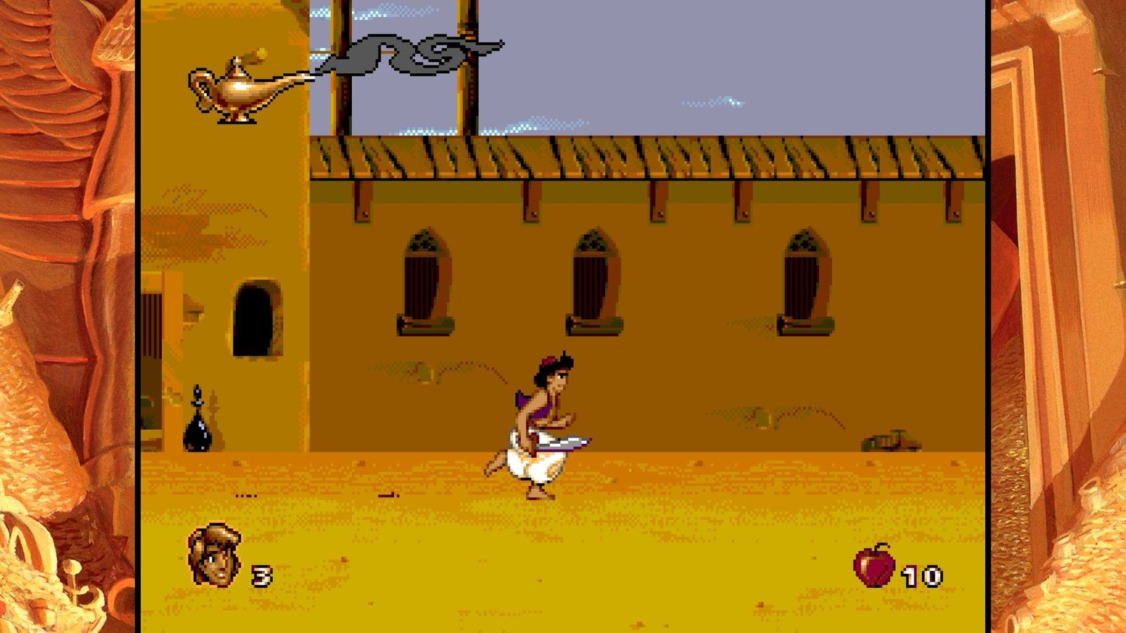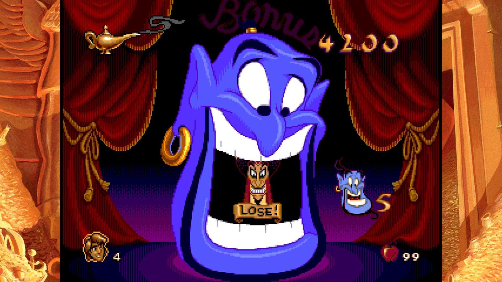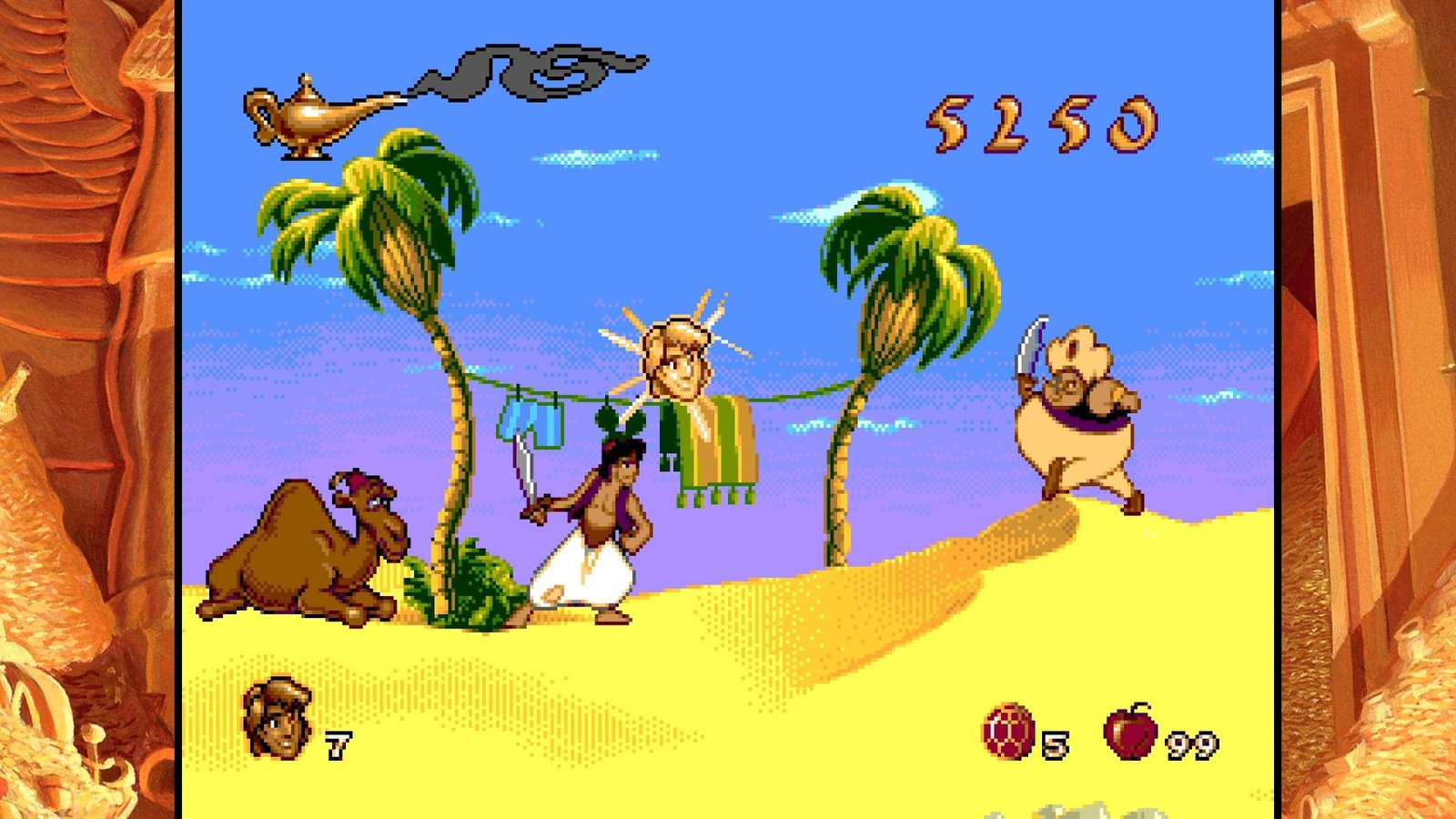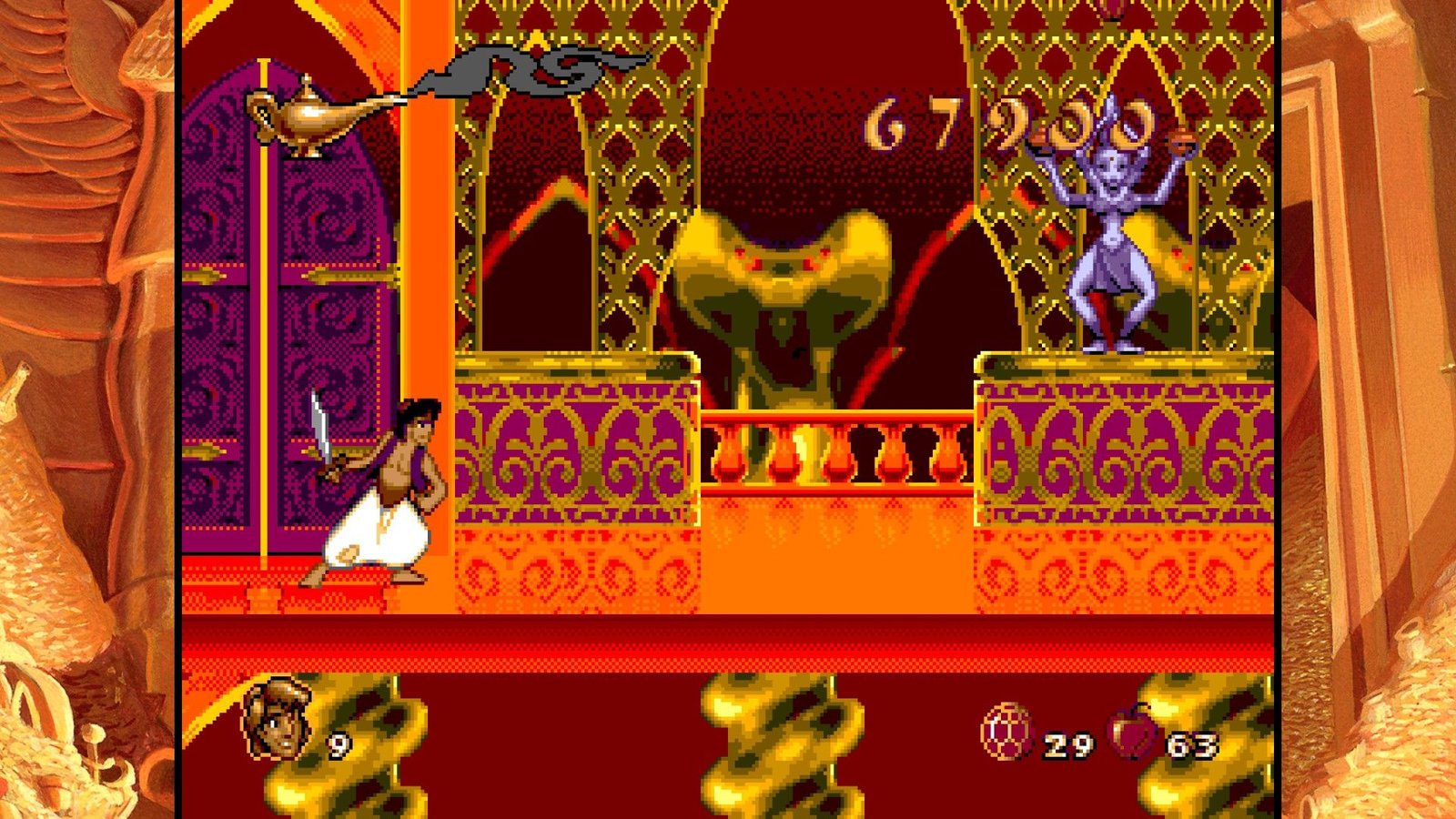 Toutes ces expériences de frustration et de difficulté injuste, Digital Eclipse nous propose de les retrouver dans un écrin accueillant et bourré de bonus sympas. Aladdin tout d’abord, bénéficie de plusieurs versions assez différentes. D’une part, l’original de la frustration, la version Genesis/Megadrive, conçu de façon à coïncider avec la sortie vidéo du film aux USA en Novembre 1993 (sachant que le film est sorti en salles en France en Novembre 1993, à l’époque on attendait un an pour avoir les films chez nous, inimaginable !), il a dû être réalisé en vitesse par une petite équipe menée par David Perry et chapeautée par Disney et ses animateurs qui ont fourni les dessins servant à réaliser les sprites de toute beauté jonchant les niveaux du jeu. En 2019, le jeu n’a toujours pas à rougir, sont pixel art rivalise encore avec les spécialistes modernes comme Wayforward, la qualité d’animation est toujours un pic de qualité et la réalisation graphique globale reste un enchantement. Agrandir l’image pour l’afficher sur nos hautes résolutions ne gâche rien mais il faudrait être un peu taré pour y jouer en plein écran avec l’image écrasée, cependant. Digital Eclipse nous propose accolée à cette version (mais un peu compliquée à trouver dans les menus confus) une version japonaise, complètement sans intérêt si on ne parle pas la langue de Kiryu Kazuma, mais aussi la version demo présentée au CES de Chicago en juin 1993, soit une version n’ayant eu que six mois de production complète et qui est loin d’être finie, mais une curiosité intéressante. Cette version est d’ailleurs encore plus difficile que le jeu final, chapeau aux journalistes de l’époque s’ils ont pu la terminer… Enfin, la dernière version proposée est une version patchée du jeu, plus agréable à jouer car les hitboxes des plateformes ont été modifiées, rendant le jeu moins frustrant, mais il reste très difficile tout de même. Plus anecdotique, la version Game Boy est présente (ainsi qu’une version colorisée, mais qui n’est pas la version Game Boy color). Il manque cependant les version Game Gear et Master System, ainsi que la version Super Nintendo faite par Capcom (et Shinji Mikami quand même), la meilleure version du jeu d’un point de vue gameplayOu « jouabilité » en français, fait référence à la façon dont le joueur interagit avec un jeu vidéo. (level design, systeme de jeu, etc.). Un musée présente des vidéos et des images du jeu, making off et éléments présents et abandonnés du jeu Megadrive final.