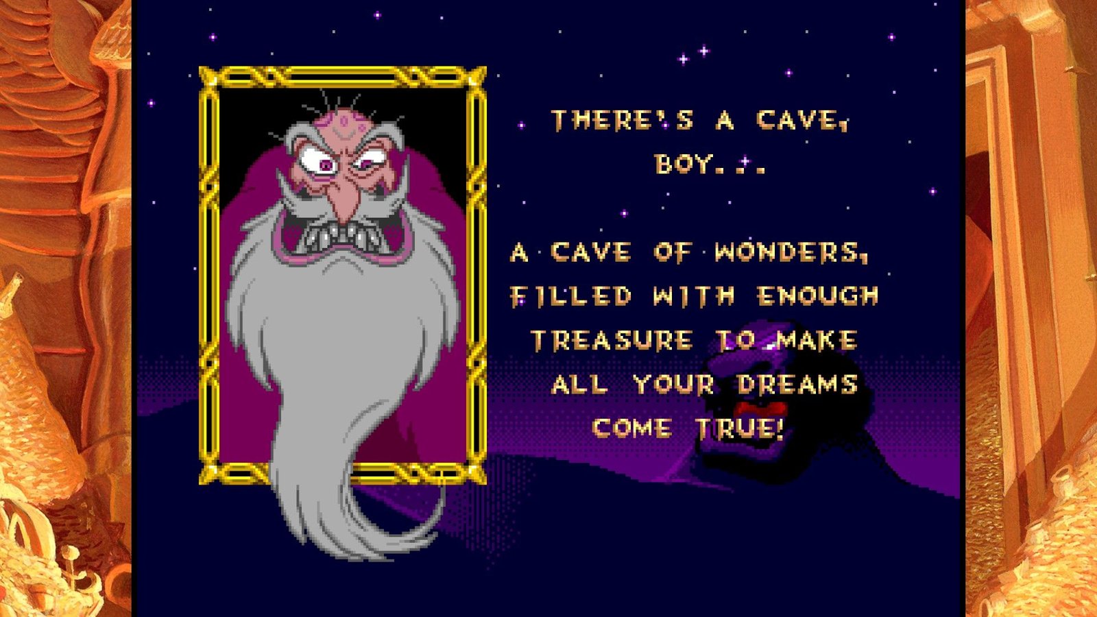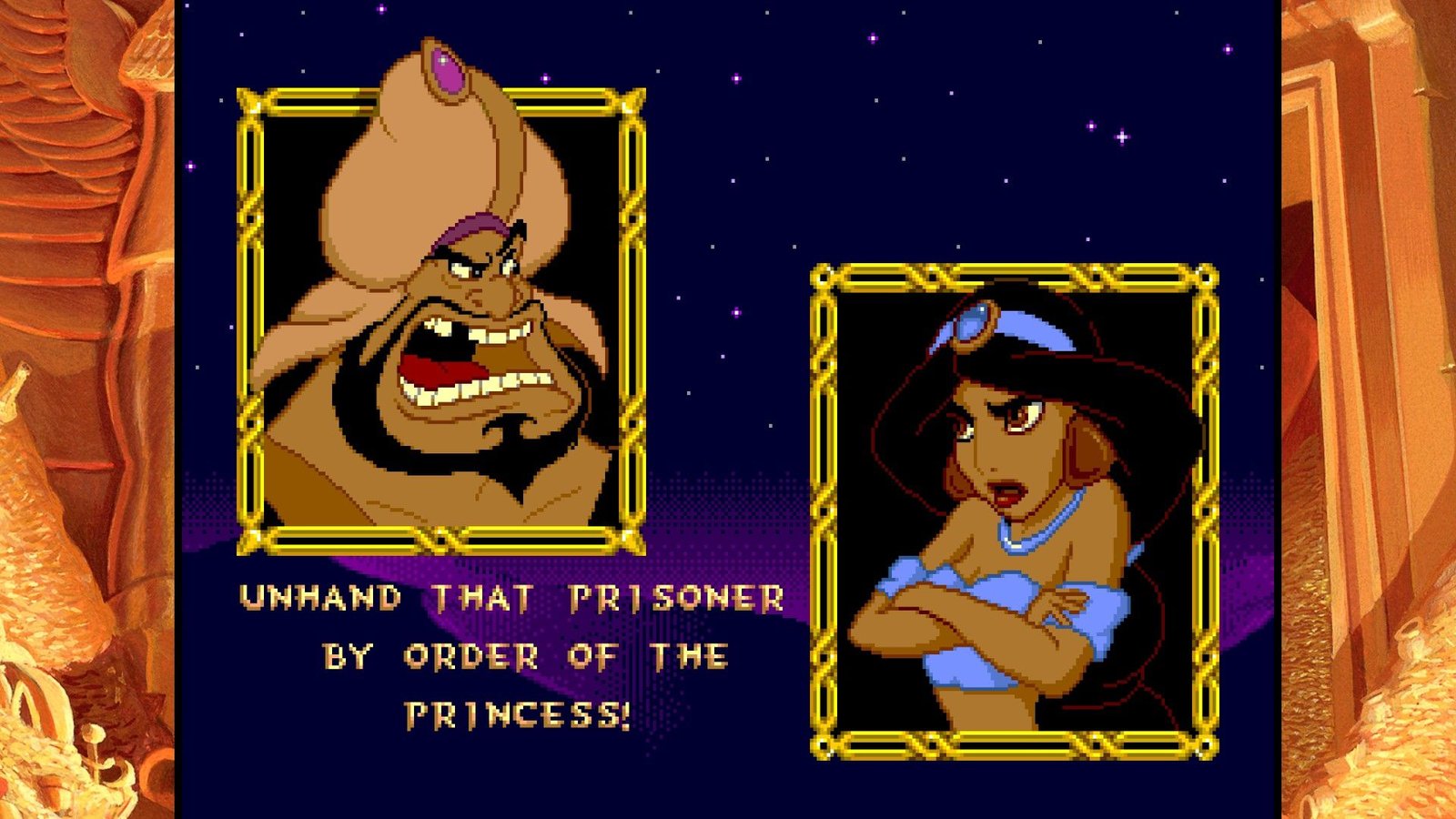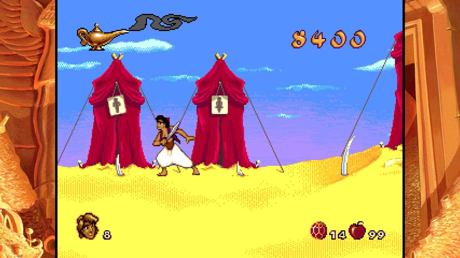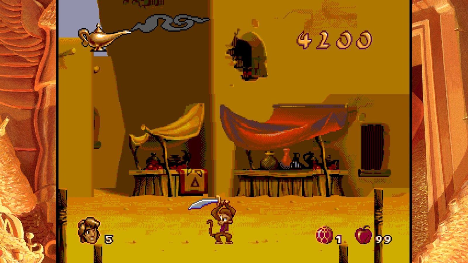 Toutes ces expériences de frustration et de difficulté injuste, Digital Eclipse nous propose de les retrouver dans un écrin accueillant et bourré de bonus sympas. Aladdin tout d’abord, bénéficie de plusieurs versions assez différentes. D’une part, l’original de la frustration, la version Genesis/Megadrive, conçu de façon à coïncider avec la sortie vidéo du film aux USA en Novembre 1993 (sachant que le film est sorti en salles en France en Novembre 1993, à l’époque on attendait un an pour avoir les films chez nous, inimaginable !), il a dû être réalisé en vitesse par une petite équipe menée par David Perry et chapeautée par Disney et ses animateurs qui ont fourni les dessins servant à réaliser les sprites de toute beauté jonchant les niveaux du jeu. En 2019, le jeu n’a toujours pas à rougir, sont pixel art rivalise encore avec les spécialistes modernes comme Wayforward, la qualité d’animation est toujours un pic de qualité et la réalisation graphique globale reste un enchantement. Agrandir l’image pour l’afficher sur nos hautes résolutions ne gâche rien mais il faudrait être un peu taré pour y jouer en plein écran avec l’image écrasée, cependant. Digital Eclipse nous propose accolée à cette version (mais un peu compliquée à trouver dans les menus confus) une version japonaise, complètement sans intérêt si on ne parle pas la langue de Kiryu Kazuma, mais aussi la version demo présentée au CES de Chicago en juin 1993, soit une version n’ayant eu que six mois de production complète et qui est loin d’être finie, mais une curiosité intéressante. Cette version est d’ailleurs encore plus difficile que le jeu final, chapeau aux journalistes de l’époque s’ils ont pu la terminer… Enfin, la dernière version proposée est une version patchée du jeu, plus agréable à jouer car les hitboxes des plateformes ont été modifiées, rendant le jeu moins frustrant, mais il reste très difficile tout de même. Plus anecdotique, la version Game Boy est présente (ainsi qu’une version colorisée, mais qui n’est pas la version Game Boy color). Il manque cependant les version Game Gear et Master System, ainsi que la version Super Nintendo faite par Capcom (et Shinji Mikami quand même), la meilleure version du jeu d’un point de vue gameplayOu « jouabilité » en français, fait référence à la façon dont le joueur interagit avec un jeu vidéo. (level design, systeme de jeu, etc.). Un musée présente des vidéos et des images du jeu, making off et éléments présents et abandonnés du jeu Megadrive final.
