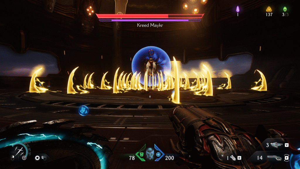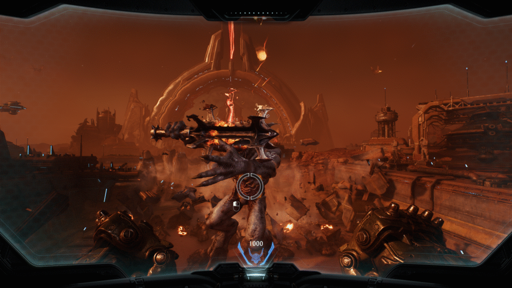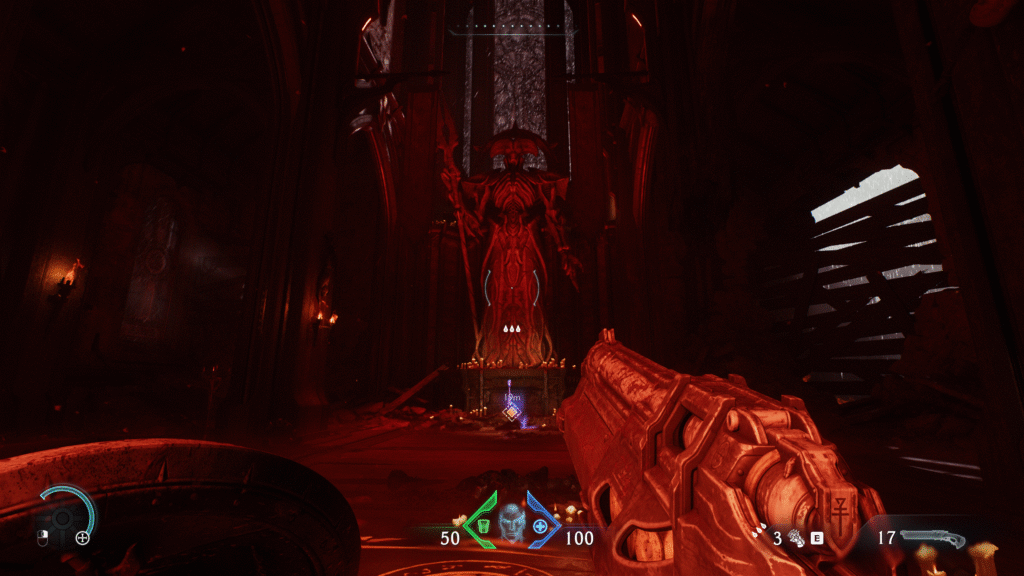 On ne va pas se mentir, les premières heures sur ce DOOM sont assez délicieuses. Le gameplay du bouclier donne une sensation d’invincibilité qui rappelle un peu DOOM (2016), on sent que rien ne peut nous arriver tant qu’on exécute les bonnes parades au bon moment et qu’on reste attentif. Le contre coup, c’est que tout repose essentiellement sur lui, éclipsant alors tout le reste. Il y a 13 armes disponibles, mais je n’ai jamais vraiment utilisé que trois d’entre elles : Le Super Shotgun, le Lance Roquette et le Chainshot (sorte de canon qui envoie un boulet, très puissant pour péter les armures). Pire encore, je me suis rendu compte que deux armes n’ont été utilisées que seulement lors de leur acquisition, puis ranger dans la poche, sans jamais en faire quoi que ce soit. Après un Eternal qui demandait globalement de jouer avec toutes les armes, c’est une sacrée chute dans l’approche du gun design, pourtant très important dans ce genre de shooter. Surtout que, la plupart des combats se passent au corps à corps, on va naturellement utiliser le plus efficace à cette portée (donc le super shotgun). Les deux autres armes sont plutôt contextuelles, dans le cas d’un gros ennemi, avec ou sans armure. Il est très simple de récupérer des munitions avec les attaques au corps à corps dès que nécessaire, et ce n’est malheureusement pas les grandes arènes dégagées qui vous forceront à vous battre à distance, vu qu’on a un dash très permissif.