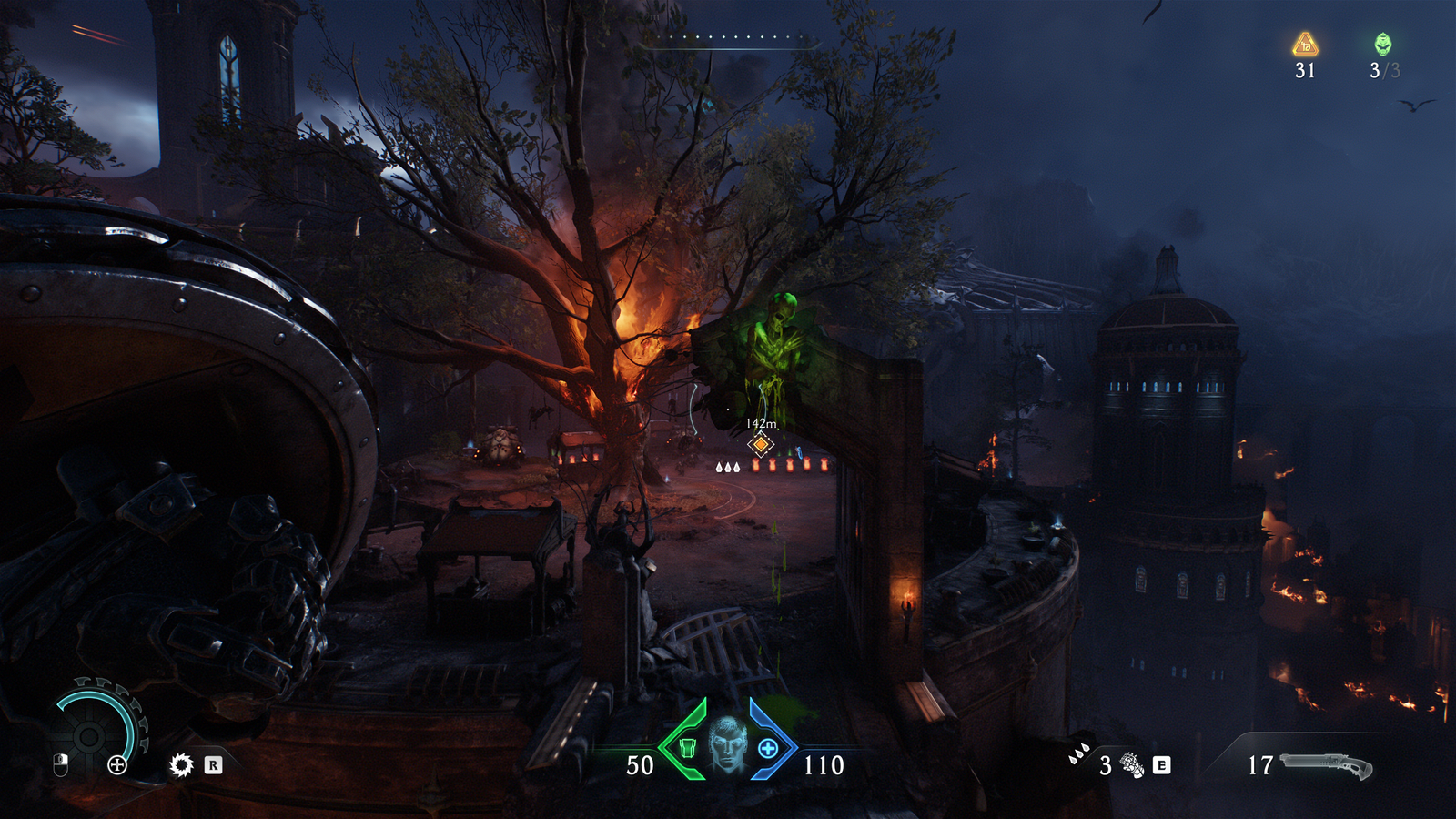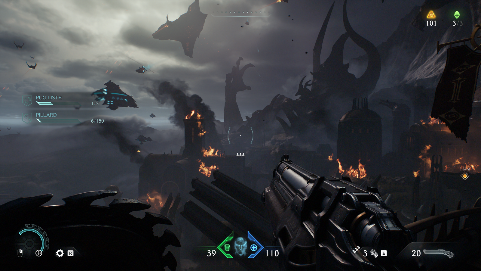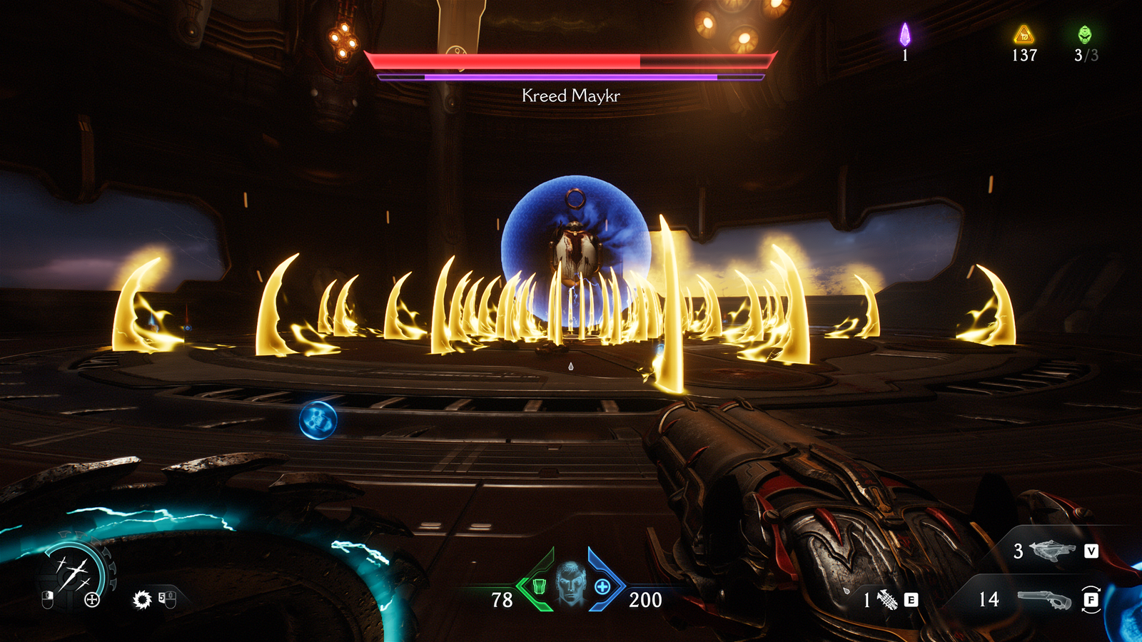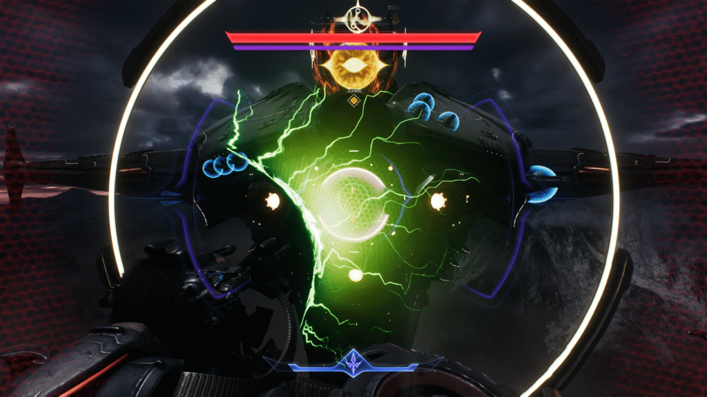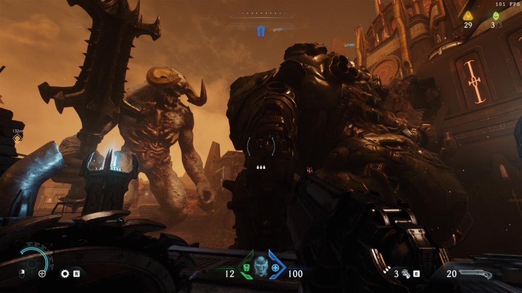 Allez, ce n’est pas grave, je peux bien m’infliger quelques dialogues mal joués/écrits tant que je tue des démons. Comme depuis le reboot, Dark Ages ajoute une subtilité à son gamedesign de flingue-couloir, cette fois-ci avec le fameux bouclier-tronçonneuse, objet phare de la communication autour du jeu et, disons-le clairement, autour de ce nouveau gameplayOu « jouabilité » en français, fait référence à la façon dont le joueur interagit avec un jeu vidéo.. On peut se la jouer « Captain America » en envoyant le bouclier un peu partout pour dézinguer des p’tits démons ou immobiliser les gros, il joue aussi son rôle dans cette réappropriation du « bullet hell ». Souvenez-vous, j’avais testé Scathe qui avait, lui aussi, eu cette idée, mais l’application manquait vraiment de finitions. Ici, deux choix ont été faits pour rendre ça agréable :