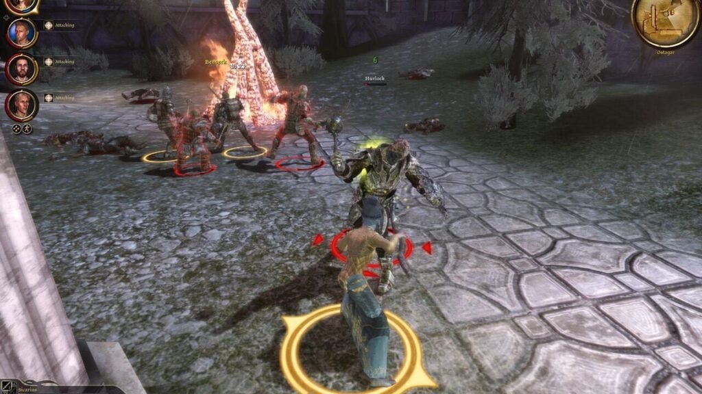 On peut ainsi assister à des dialogues entre deux coéquipiers, survenant de façon aléatoire comme à la bonne époque de Knights of the Old Republic. Avec sa soixantaine d’heures bien senties, sans terminer toutes les quêtes disponibles, Dragon Age : Origins peut bien se permettre de fâcher les puristes sur ce point-là… Gameplay rétro, mais pas trop ? Loin de l’aspect TPS (Shoot à la troisième personne) d’un Mass Effect, Dragon Age : Origins reprend la recette de ses plus vieux ainés en proposant un gameplay à mi-chemin entre Knights of the Old Republic et un simple MMO des familles. L’action peut être mise en pause à tout moment et les ordres sont donnés à chaque membre de l’équipe ou au groupe dans sa globalité. Le joueur décide réellement de la stratégie à appliquer, en plus de pouvoir accéder à des créneaux d’ordres automatiques permettant d’activer des actions en fonction de la situation. Chaque action pourra alors être contrôlée par l’I. A selon le bon vouloir du joueur, sans que celui-ci soit obligé de donner des ordres à tout bout de champ. Ces créneaux sont utiles avant tout pour les sorts de soins et l’utilisation des objets, permettant à l’équipe de ne pas mourir au moindre coup critique porté par l’ennemi.