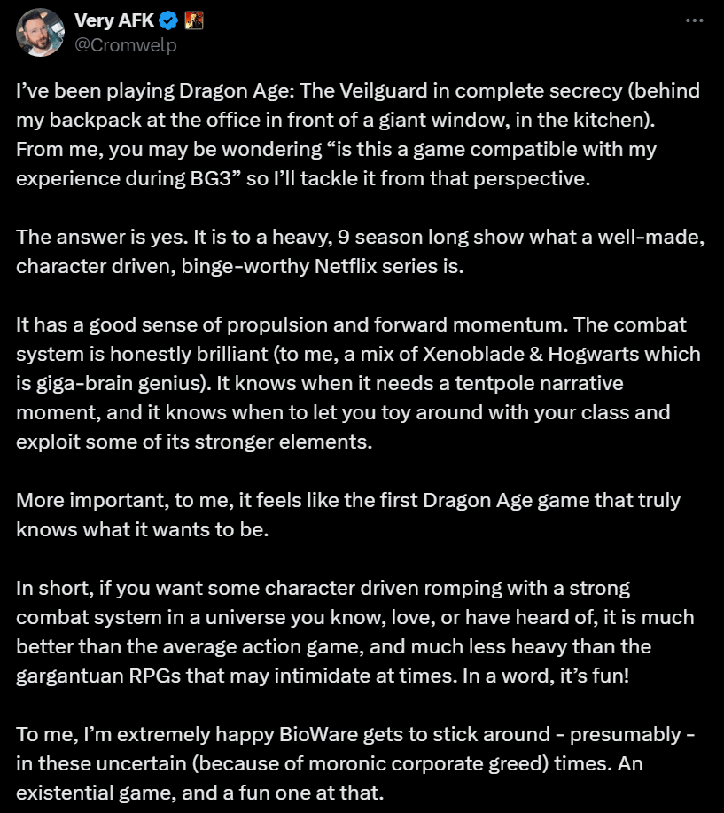 Les adeptes de Bioware ont plus en tête Mass Effect, Baldur’s Gate (les vieux) ou Star Wars KOTOR, de mon côté, j’ai personnellement beaucoup d’affect avec la série de Dragon Age . Présenté comme un descendant spirituel à Baldur’s Gate, Dragon Age : Origins s’inspirait beaucoup de D&D sans jamais le singer. Dernier représentant de la pause active, il avait ce don (qu’aura BG3) de faire un jeu de niche et de soigner suffisamment la présentation pour que le grand publique l’apprécie. Quinze ans plus tard, avec des suites pas souvent reçues à leur juste valeur et des jeux comme Mass Effect Andromeda et Anthem sortis entre temps, Bioware revient de ce qu’on voyait déjà comme un cercueil pour apporter ce que veulent les fans : un quatrième épisode — The Veilguard .
