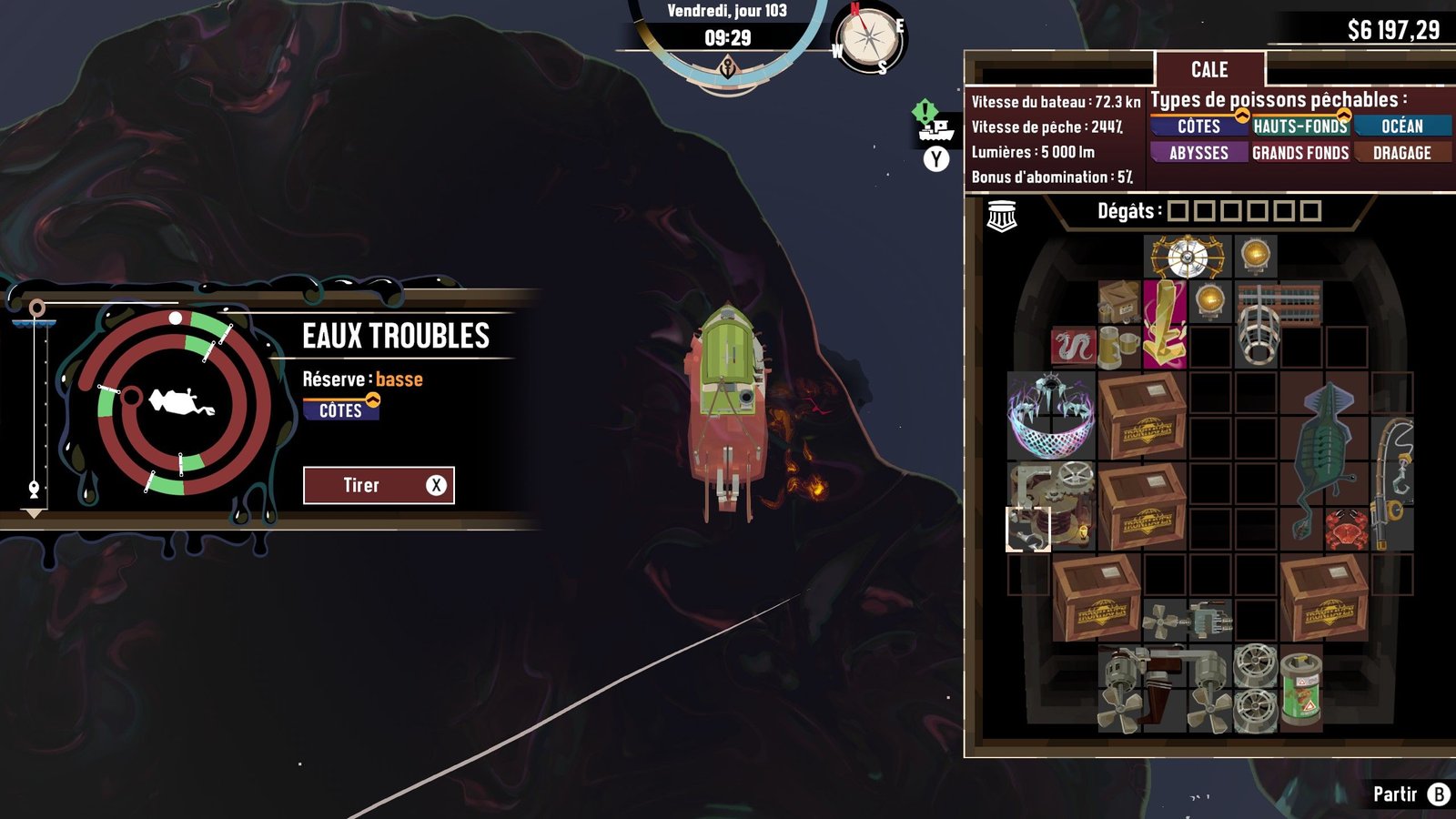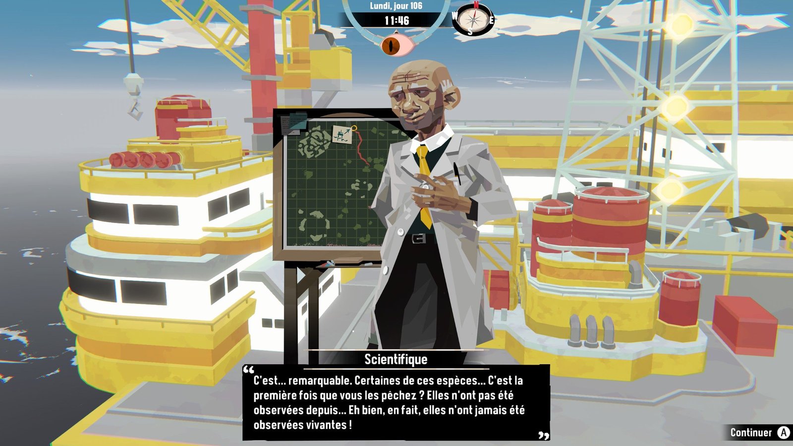 Parlons de la progression justement. Comme indiqué, The Iron Rig n’ajoute pas de nouvelles zones, mais va vous faire revisiter toutes les anciennes dans lesquelles va se répandre une étrange substance noire liée à l’apparition de nouvelles espèces. Sans en dévoiler plus, c’est donc l’occasion de vous donner de nouvelles missions, de nouveaux poissons à pêcher à l’aide d’une nouvelle canne à pêche ou autres paniers de crabes et prolonger ainsi l’aventure avec un peu plus de la boucle de gameplay maintenant bien connue. Un principe qui permettra aux joueurs de replonger un peu plus, même si ceux ayant fini l’aventure profiteront de fait bien moins des nouveautés proposées, à moins qu’ils ne décident de recommencer une nouvelle partie.