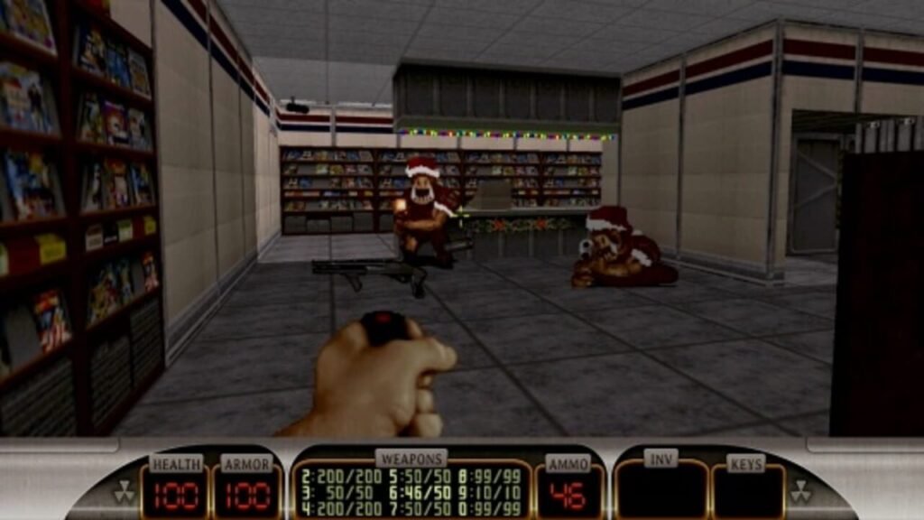 Néanmoins, même si Duke Nukem 3D a salement pris un coup de vieux et que par conséquent, on sait pourquoi celui-ci n’a pas la moitié de la qualité d’un bon vieux Doom des familles, il n’en est pas moins sacrèment fun. En plus de ces trois épisodes originaux , il y a la nouvelle campagne « Atomic Edition » qui propose un jeu beaucoup plus balèze, des niveaux horriblement durs, mais bien conçus. Les hardcore-gamers apprecieront, surtout ceux qui aiment sauvegarder/charger sauvagement à chaque pas et ennemis abattu. S’en suit alors « Out in D. C », se déroulant à la maison blanche ou au mémorial Lincoln et qui n’a pas la même allure d’un point de vue du gameplayOu « jouabilité » en français, fait référence à la façon dont le joueur interagit avec un jeu vidéo. même si, il faut l’avouer, les décors sont très amusants à découvrir. « Tiens, un pack de grenade derrière l’estrade, normal ! ». On regrettera par contre l’apparition des deux autres extensions ajoutées : Life’s a Beach, qui met des lunettes noires et des chemises à fleurs à tous les ennemis dans un level-design chaotique (mais marrant) et surtout, l’horrible, l’infernal, le carnage visuel qu’est Nuclear Winter plaçant des bonhommes de neige maléfiques et immondes dans un mashup de niveaux originaux.
