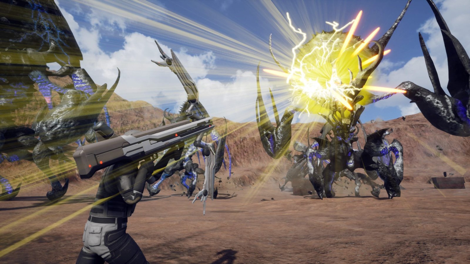Deux classes sont disponibles au départ : le Trooper (l’équivalent du Ranger) ainsi que le Jet Lifter (l’équivalent du Wing Diver). Première différence avec nos habitudes, on peut changer d’achétype à tout instant, les pouvoirs sont conférés par une sorte d’exo-squelette. Deux autres classes se déverrouilleront durant la campagne : l’Heavy Striker (l’équivalent du Fencer) et le Prowl Rider, totalement inédit, faisant penser aux troupes de défense de l’Attaque des Titans avec sa capacité à lancer des filins pour se balancer et voltiger autour des créatures gigantesques.